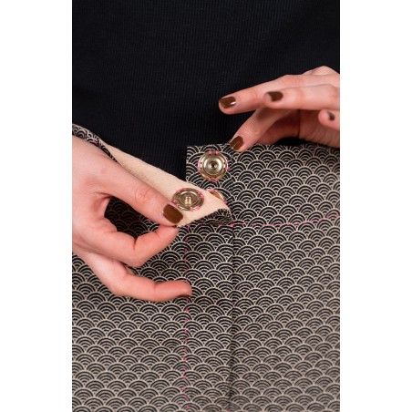 Il suo tessuto è il famoso e prezioso crespo di seta stampato con delicate geometrie e armonie cromatiche, tipiche della grazia giapponese. Era tra i tesori contenuti nelle valigie del ritorno da un viaggio di ricerca in Giappone.