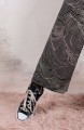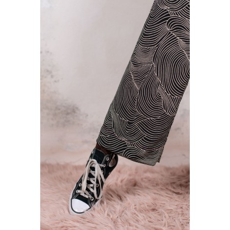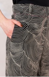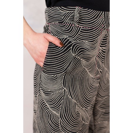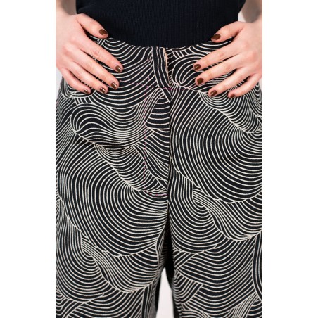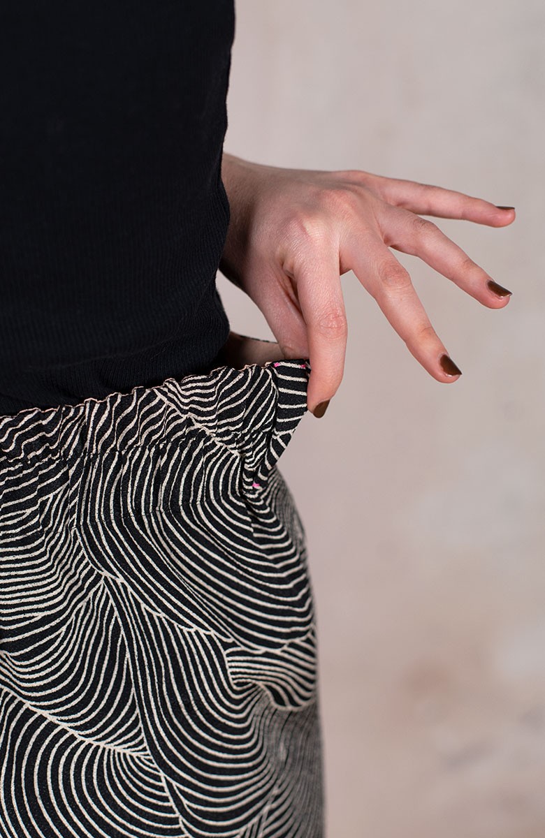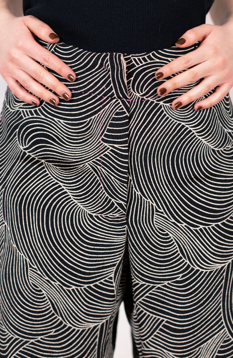 Ispirato al pantalone da lavoro da uomo, ma ricostruito attraverso volumi, proporzioni e dettagli iperfemminili, è il pantalone che va indossato con un'attitudine rilassata, a vita bassa, un po' baggy. Ha la gamba dritta, l'elastico dietro, le tasche profonde la patta e i passanti per la cintura. Il cinturino, gli orli e la patta sono rifiniti con filze fatte a mano, la zip è stata tolta e i 2 bottoni automatici sono cuciti a mano. Un dettaglio importantissimo e per nulla scontato è il taglio lungo il fianco. Non è dritto, ma ruotato. Parte dal bacino davanti e arriva al fondo dietro. È una linea studiata al millimetro che veste la gamba, abbracciandola: armonia perfetta.