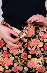 Ispirato al pantalone da lavoro da uomo, ma ricostruito attraverso volumi, proporzioni e dettagli iperfemminili, è il pantalone che va indossato con un'attitudine rilassata, a vita bassa, un po' baggy. Ha la gamba dritta, l'elastico dietro, le tasche profonde la patta e i passanti per la cintura. Il cinturino, gli orli e la patta sono rifiniti con filze fatte a mano, la zip è stata tolta e i 2 bottoni automatici sono cuciti a mano. Un dettaglio importantissimo e per nulla scontato è il taglio lungo il fianco. Non è dritto, ma ruotato. Parte dal bacino davanti e arriva al fondo dietro. È una linea studiata al millimetro che veste la gamba, abbracciandola: armonia perfetta.