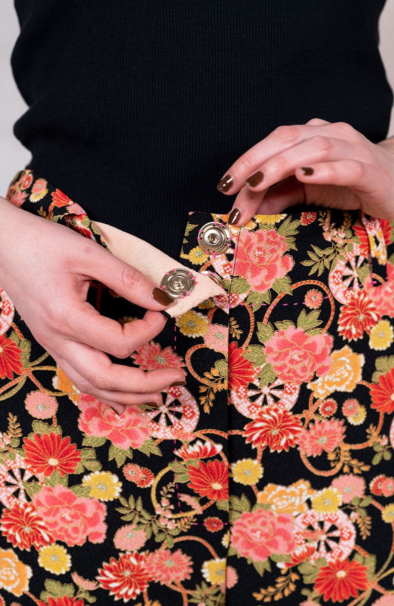Il suo tessuto è il famoso e prezioso crespo di seta stampato con delicate geometrie e armonie cromatiche, tipiche della grazia giapponese. Era tra i tesori contenuti nelle valigie del ritorno da un viaggio di ricerca in Giappone.