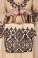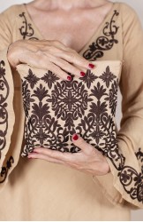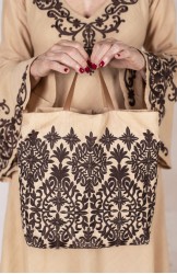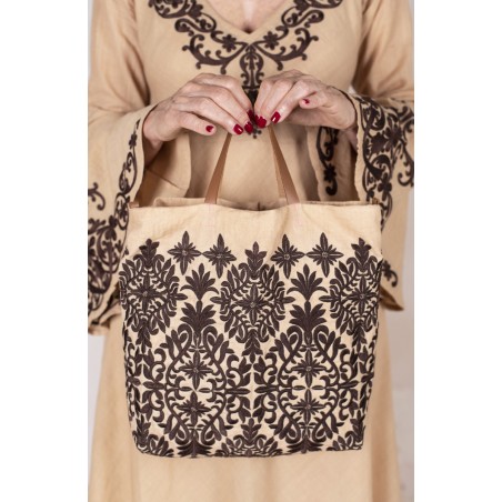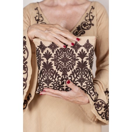 Borsina di lino ricamata, che contiene una pochette anch’essa di lino e altrettanto ricamata con chiusura a zip. È fissata alla borsina con dei piccoli ganci interni apribili, così, con un semplice gesto, lei diventa una pochette da usare separatamente. I loro ricami sono ispirati a quelli di cuscini marocchini, acquistati durante un viaggio di team building a Marrakech.
