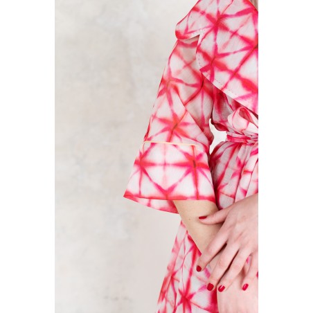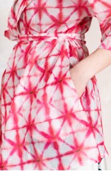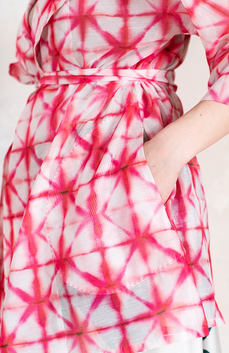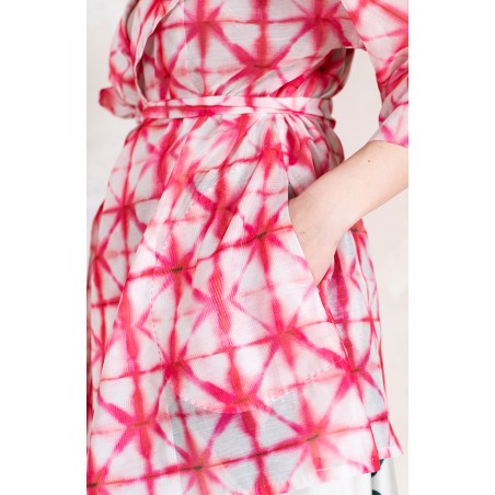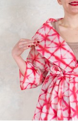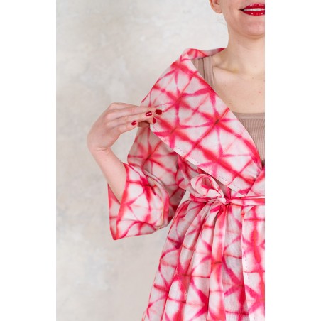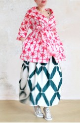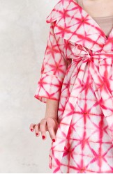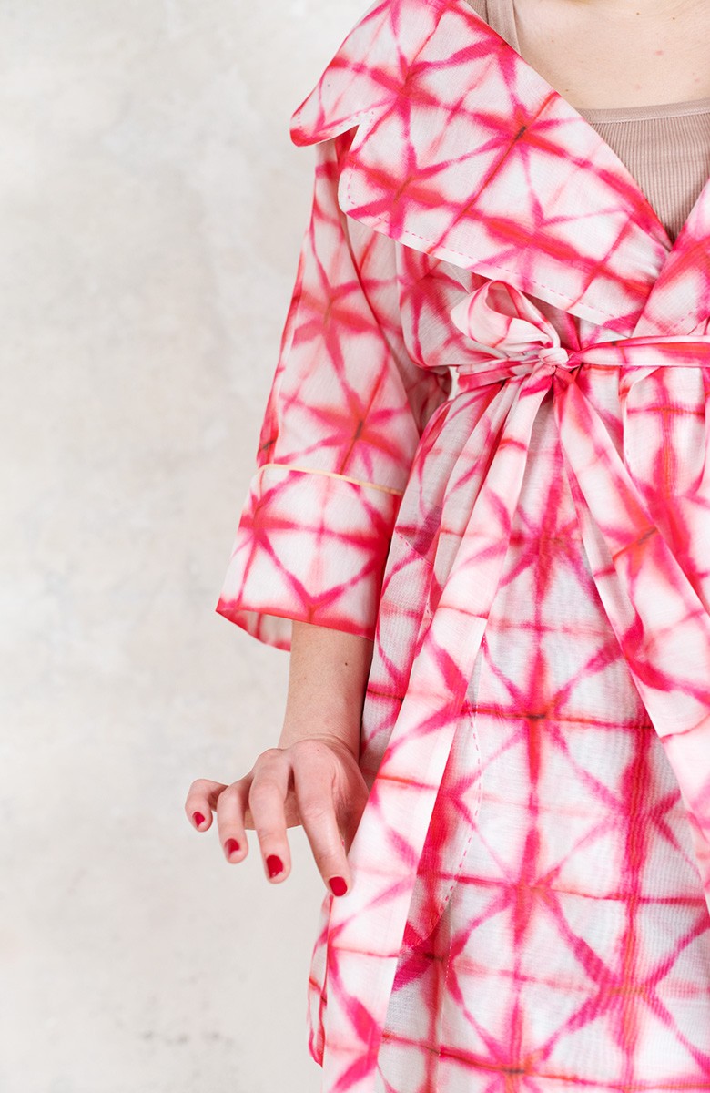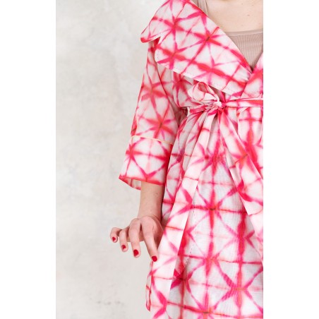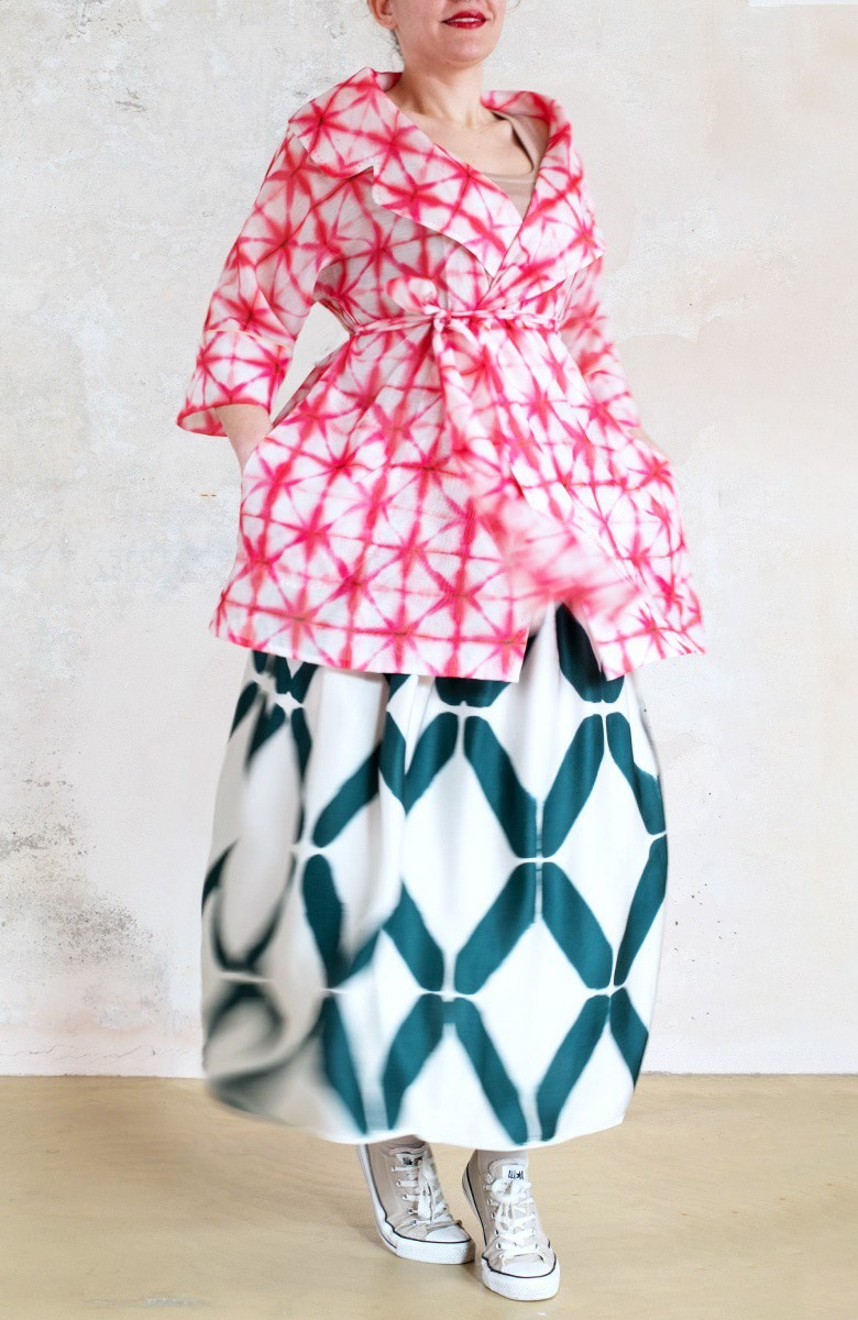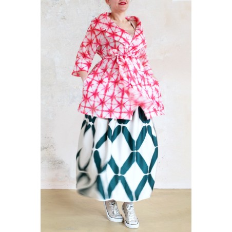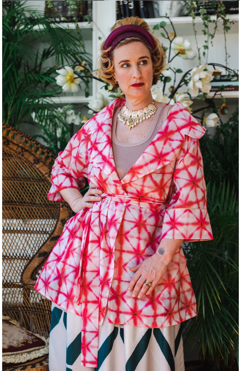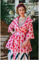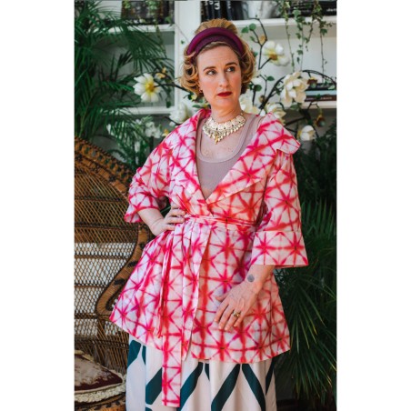 Ispirata ai capispalla anni Cinquanta, la Queen Jacket Travel Edition è la versione iper femminile di un capo solitamente vissuto come il maschile per eccellenza. Il suo tessuto stampato è leggero e morbido. Il cartamodello è stato studiato nel dettaglio, per arrivare a una forma che illumina e valorizza spalle, vita e décolleté con il suo collo ampio, la sua manica a raglan a tre quarti, la sua cintura nello stesso tessuto da stringere e portare sotto il seno. Le tasche profonde sui fianchi, le impunture a vista fatte a mano, le cuciture all’inglese, i sottopunti a mano, il piping sul fondomanica sono il suo manifesto sartoriale.