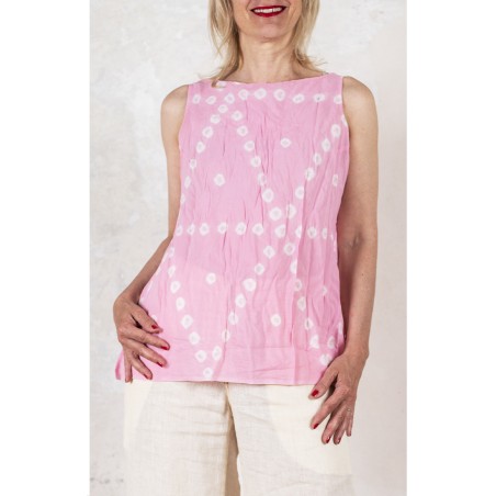 Top di cotone e viscosa tinto a mano con l'antica tecnica shibori. Spacchi sui fianchi, scollo a barchetta, cimosa al fondo e profili rifiniti tutti a mano. Tessuto increspato con effetto stropicciatura. L’increspatura è ottenuta attraverso le seguenti semplici azioni: dopo averlo lavato, il top viene attorcigliato e annodato; viene quindi lasciato ad asciugare così, appoggiato però sopra un asciugamano sullo stendino; quindi, una volta sciolti i nodi, il tessuto avrà acquisito una plissettatura naturale. Leggero come un petalo, fresco come vento sottile, pieno di punti cuciti a mano. Pesa pochi grammi e lo riceverai dentro un sacchettino di organza. Più lo lavi e lo asciughi annodato e attorcigliato, più diventa bello.