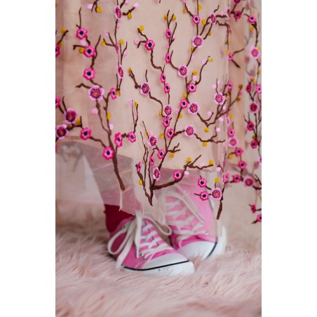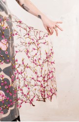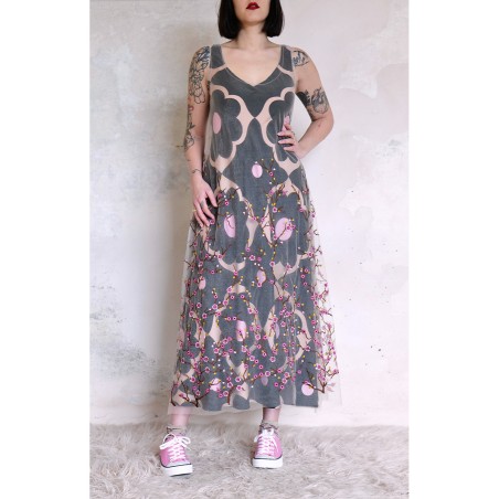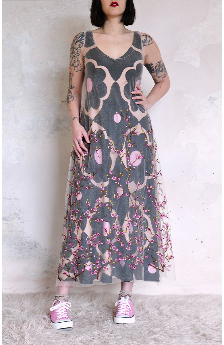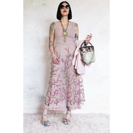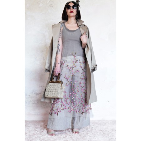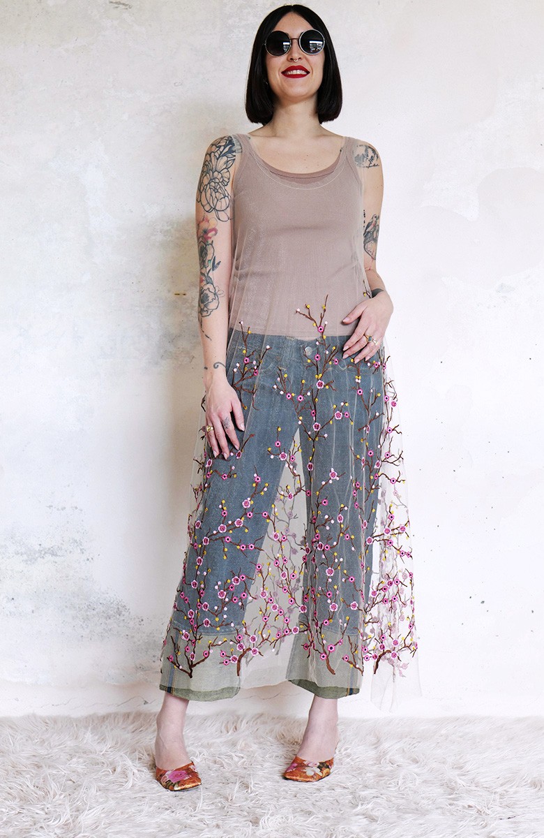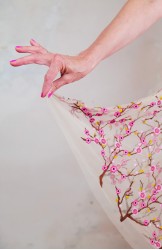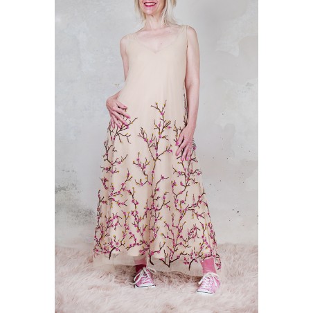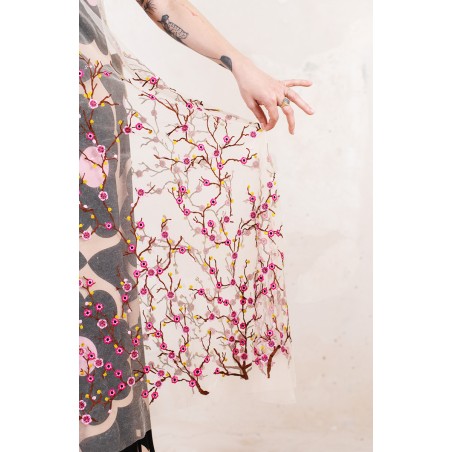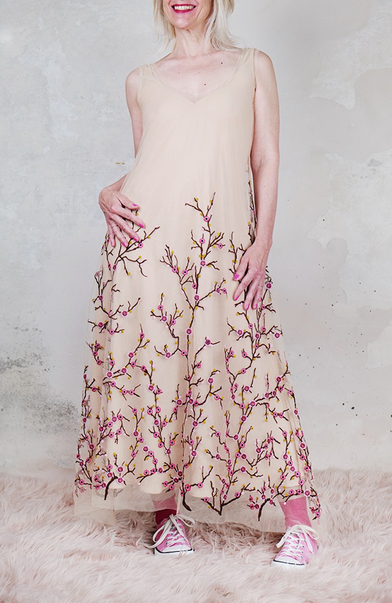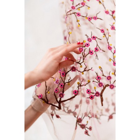 Abito in tulle impalpabile, morbido e trasparente, color cipria ricamato con rami di ciliegio in fioritura. Il ricamo è posizionato sull’abito per restituire l’immagine poetica di una fioritura che sale dal basso e avvolge la tua silhouette. É l'abito da sera da viaggio perfetto, l'abito da party che puoi tenere in tasca, l’abito da giorno che trasforma ogni tuo outfit in qualsiasi cosa tu desideri. Lo puoi indossare anche sopra i jeans e la canotta. Contenuto in un sacchettino di organza con il suo stesso ricamo, lo potrai portare con te ovunque andrai, senza peso e senza ingombro.