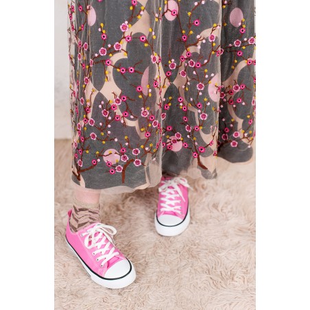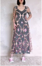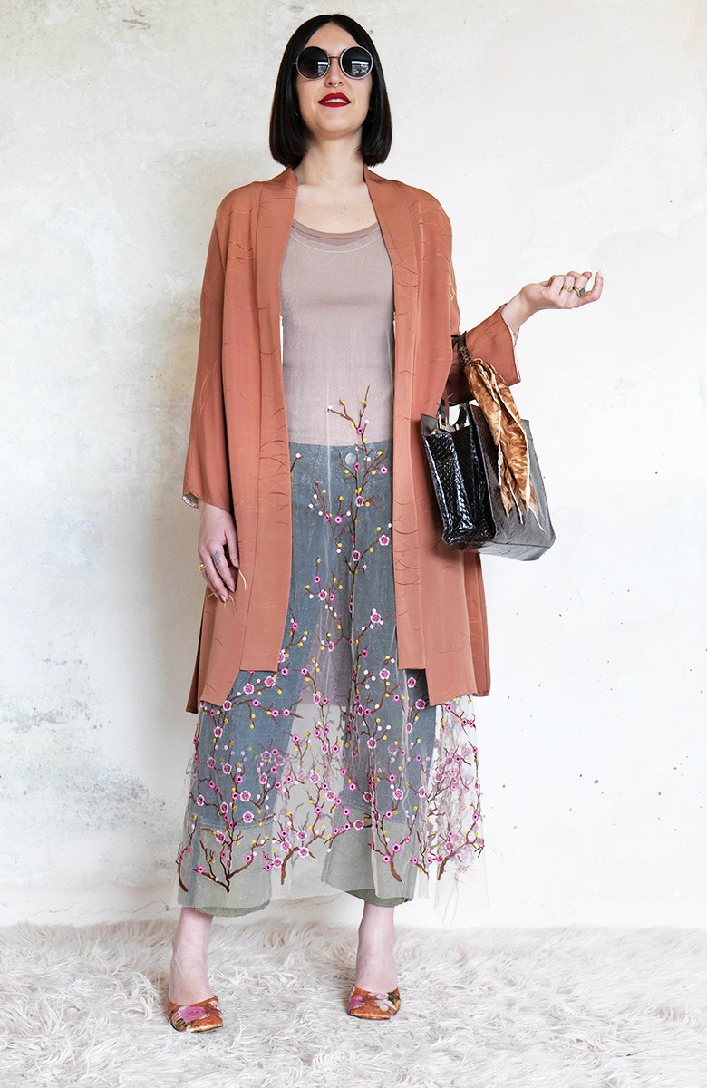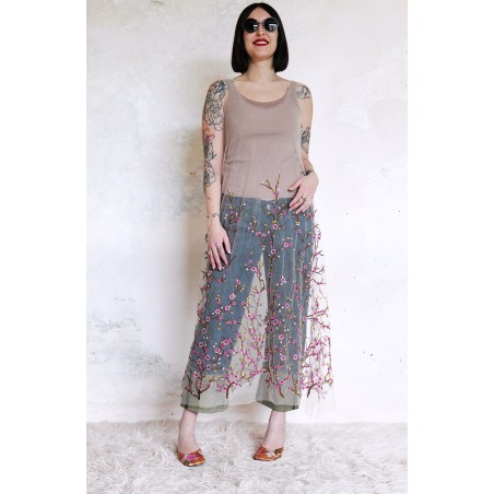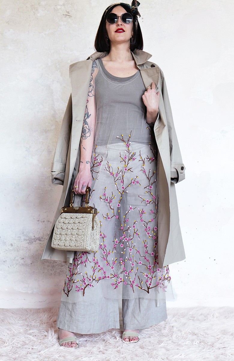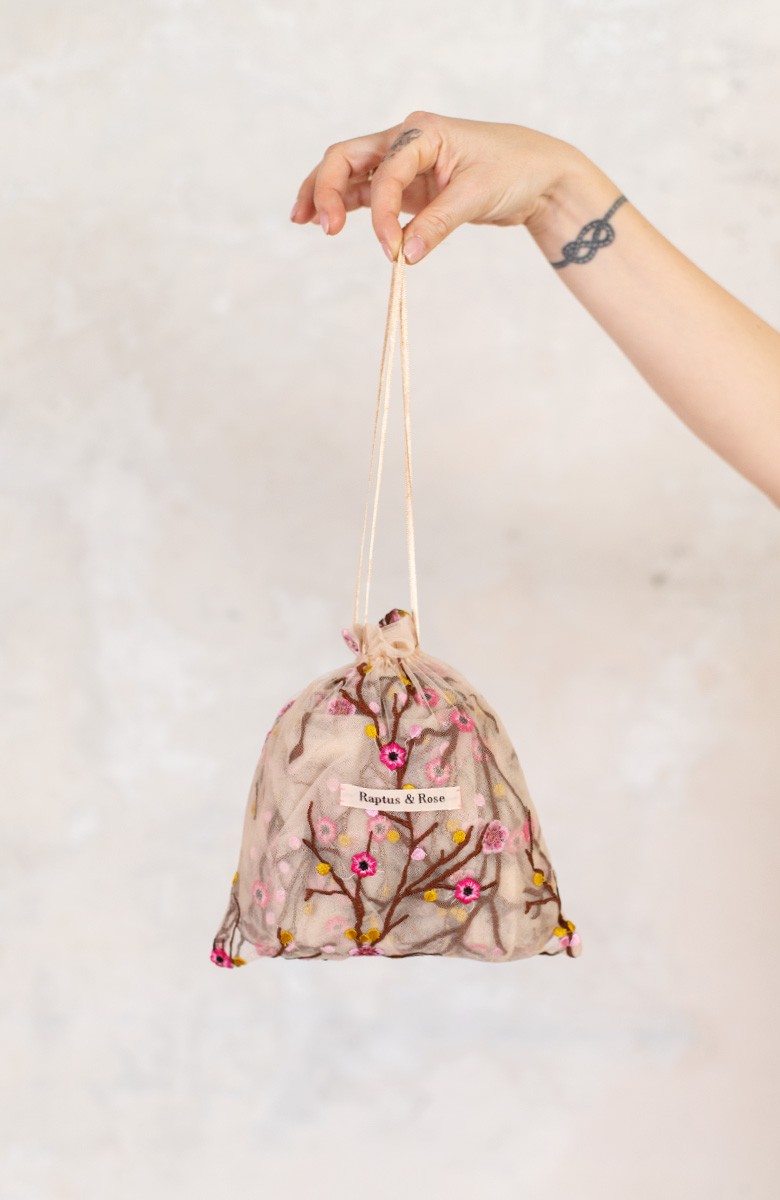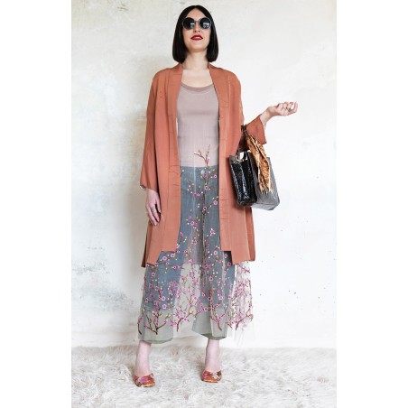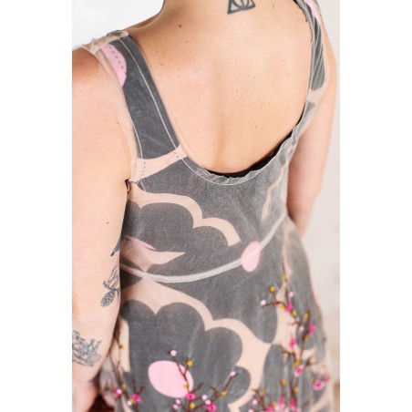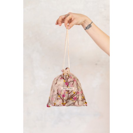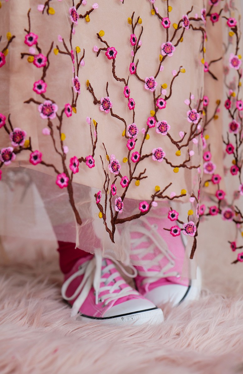 Abito in tulle impalpabile, morbido e trasparente, color cipria ricamato con rami di ciliegio in fioritura. Il ricamo è posizionato sull’abito per restituire l’immagine poetica di una fioritura che sale dal basso e avvolge la tua silhouette. É l'abito da sera da viaggio perfetto, l'abito da party che puoi tenere in tasca, l’abito da giorno che trasforma ogni tuo outfit in qualsiasi cosa tu desideri. Lo puoi indossare anche sopra i jeans e la canotta. Contenuto in un sacchettino di organza con il suo stesso ricamo, lo potrai portare con te ovunque andrai, senza peso e senza ingombro.