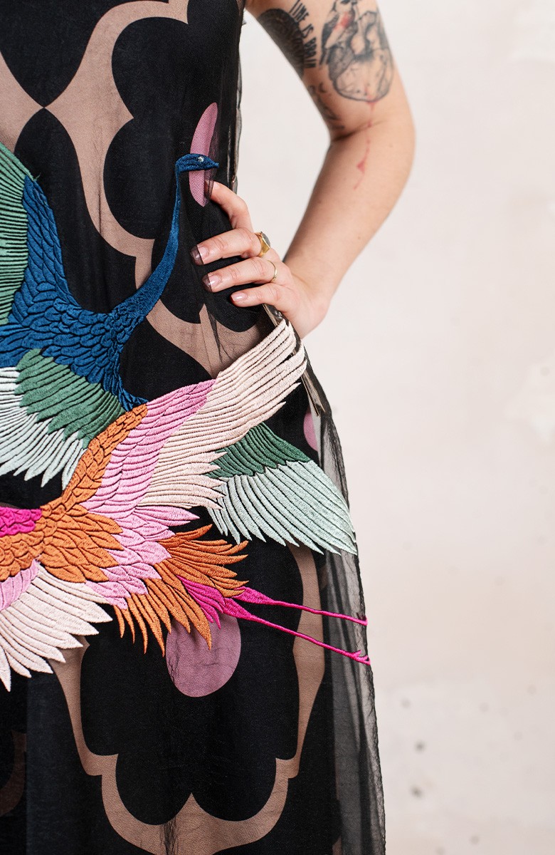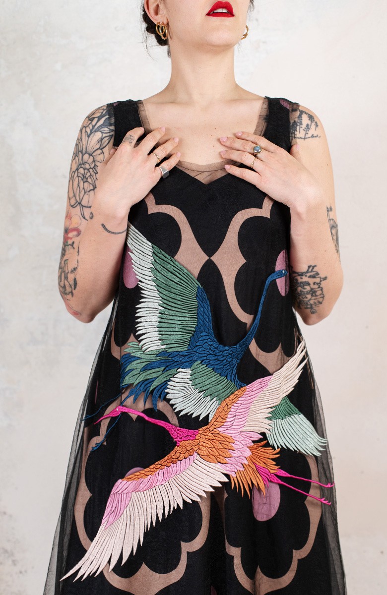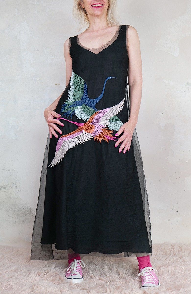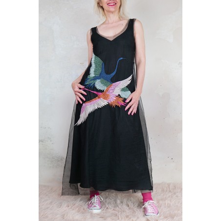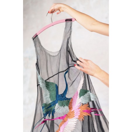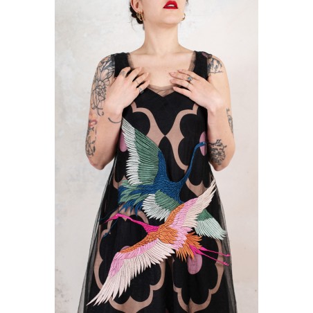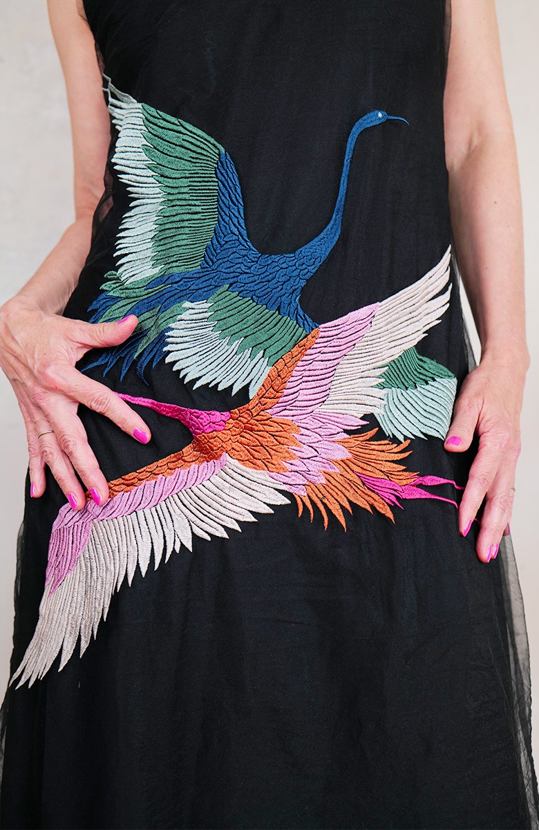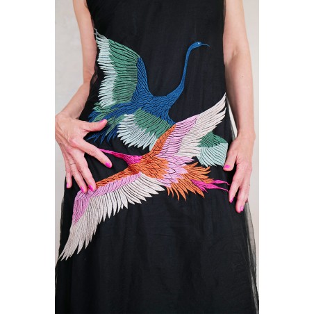 Abito in tulle impalpabile, morbido e trasparente, color nero ricamato con due aironi colorati. Il ricamo è posizionato sull’abito con quell’equilibrio poetico che accompagna la tua silhouette. É l'abito da sera da viaggio perfetto, l'abito da party che puoi tenere in tasca, l’abito che trasforma ogni tuo outfit in qualsiasi cosa tu desideri. Lo puoi indossare anche sopra i jeans e la canotta. Contenuto in un sacchettino di organza con il suo stesso ricamo, lo potrai portare con te ovunque andrai, senza peso e senza ingombro.