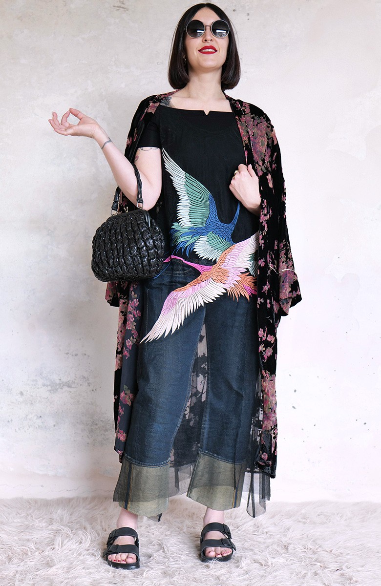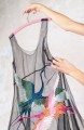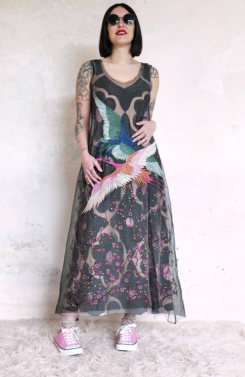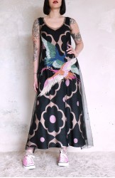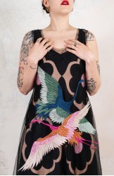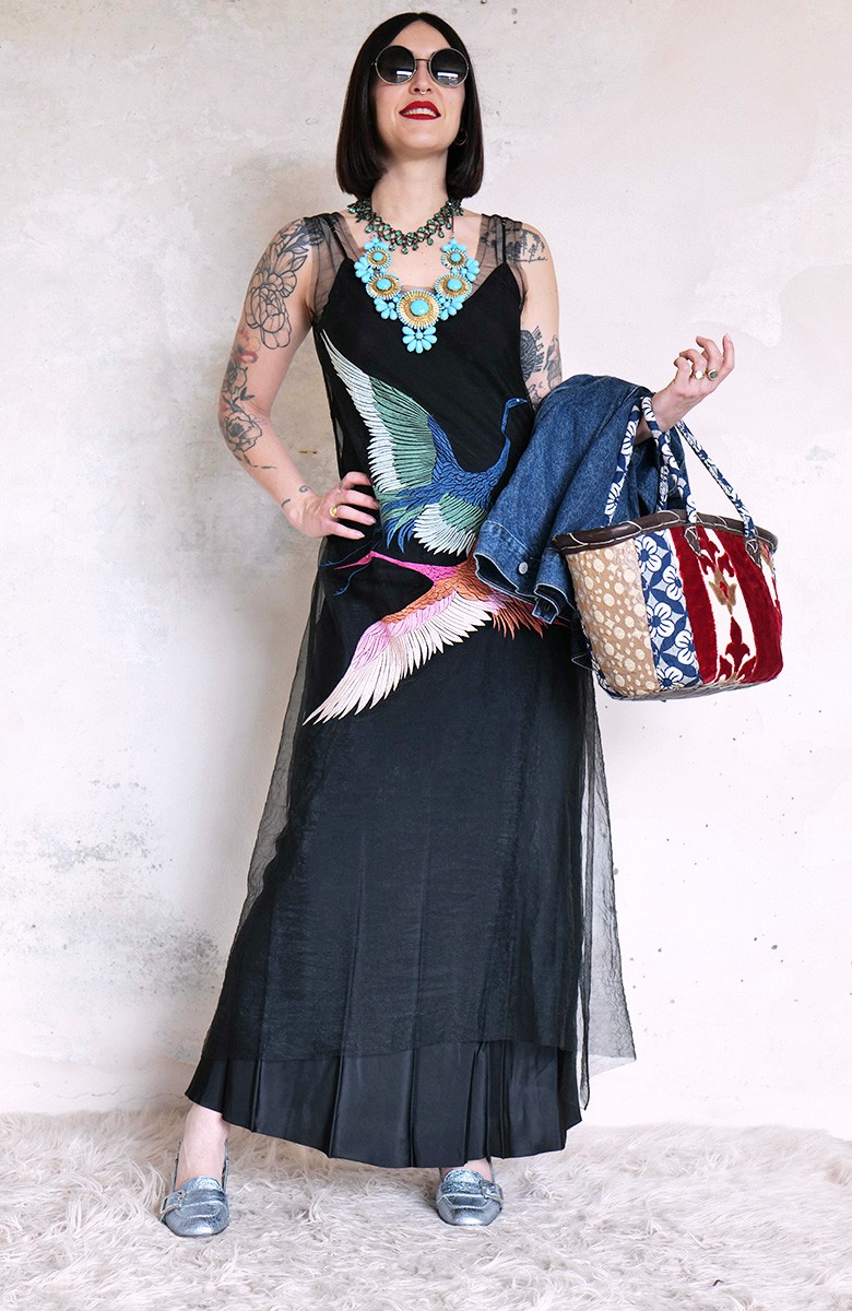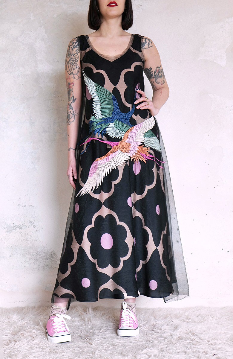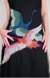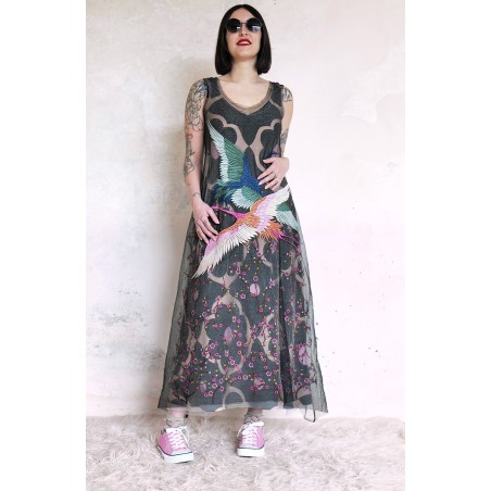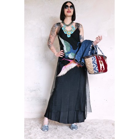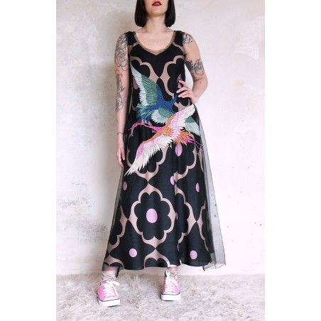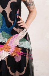 Abito in tulle impalpabile, morbido e trasparente, color nero ricamato con due aironi colorati. Il ricamo è posizionato sull’abito con quell’equilibrio poetico che accompagna la tua silhouette. É l'abito da sera da viaggio perfetto, l'abito da party che puoi tenere in tasca, l’abito che trasforma ogni tuo outfit in qualsiasi cosa tu desideri. Lo puoi indossare anche sopra i jeans e la canotta. Contenuto in un sacchettino di organza con il suo stesso ricamo, lo potrai portare con te ovunque andrai, senza peso e senza ingombro.