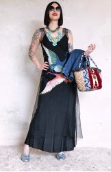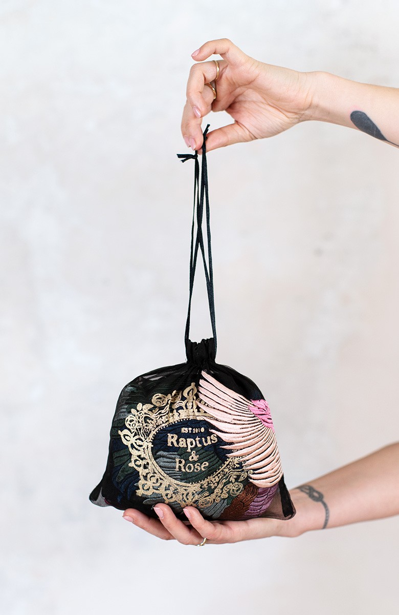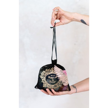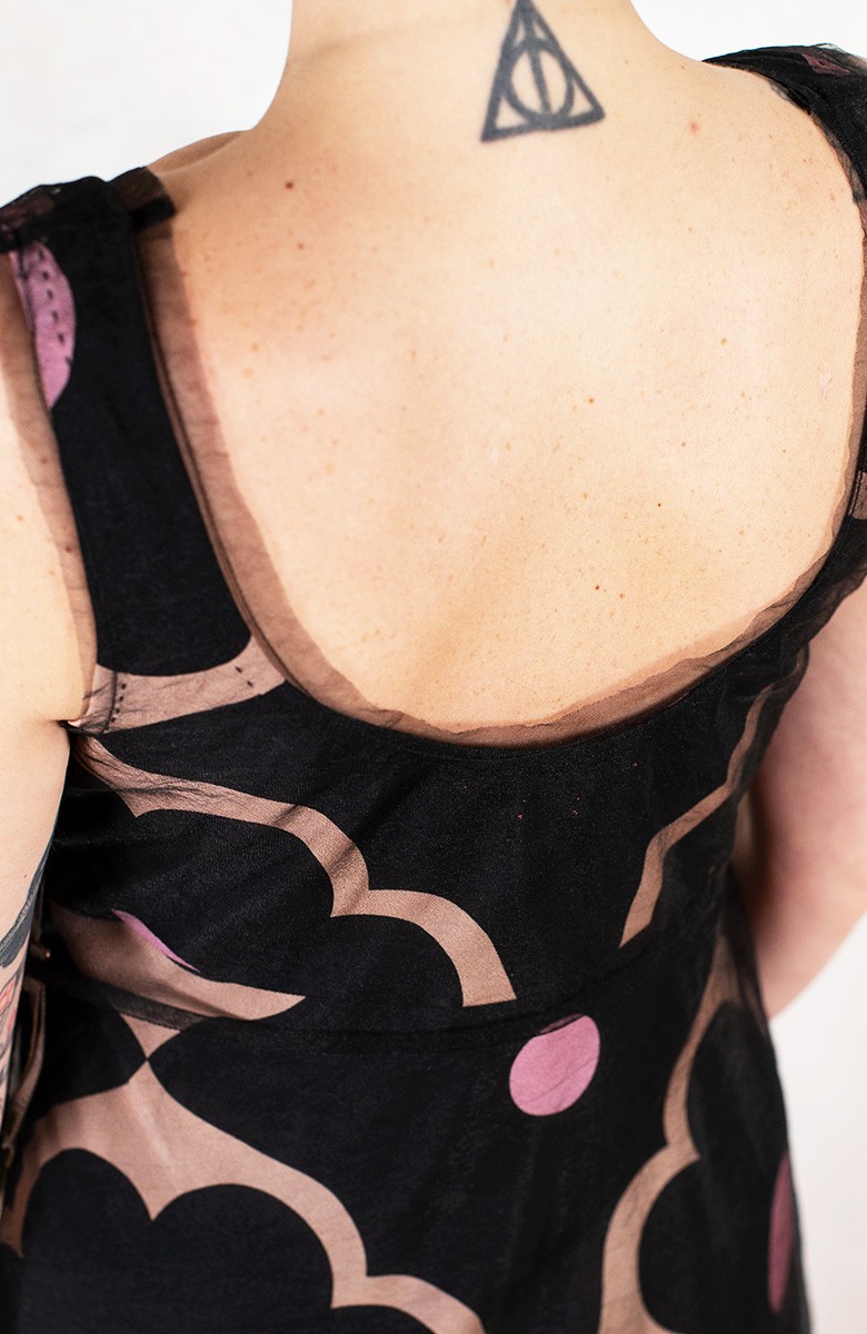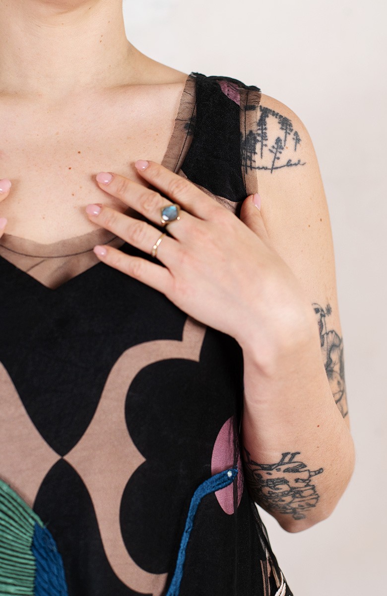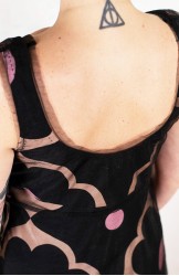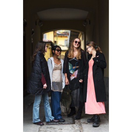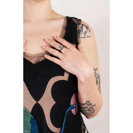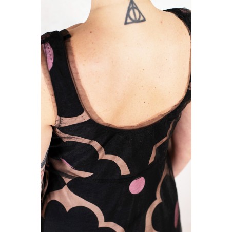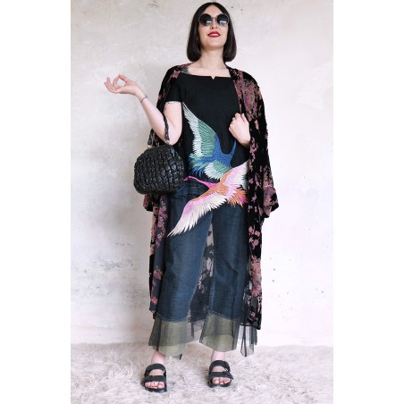 Abito in tulle impalpabile, morbido e trasparente, color nero ricamato con due aironi colorati. Il ricamo è posizionato sull’abito con quell’equilibrio poetico che accompagna la tua silhouette. É l'abito da sera da viaggio perfetto, l'abito da party che puoi tenere in tasca, l’abito che trasforma ogni tuo outfit in qualsiasi cosa tu desideri. Lo puoi indossare anche sopra i jeans e la canotta. Contenuto in un sacchettino di organza con il suo stesso ricamo, lo potrai portare con te ovunque andrai, senza peso e senza ingombro.