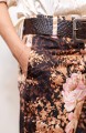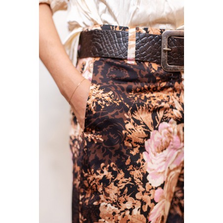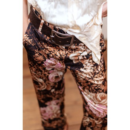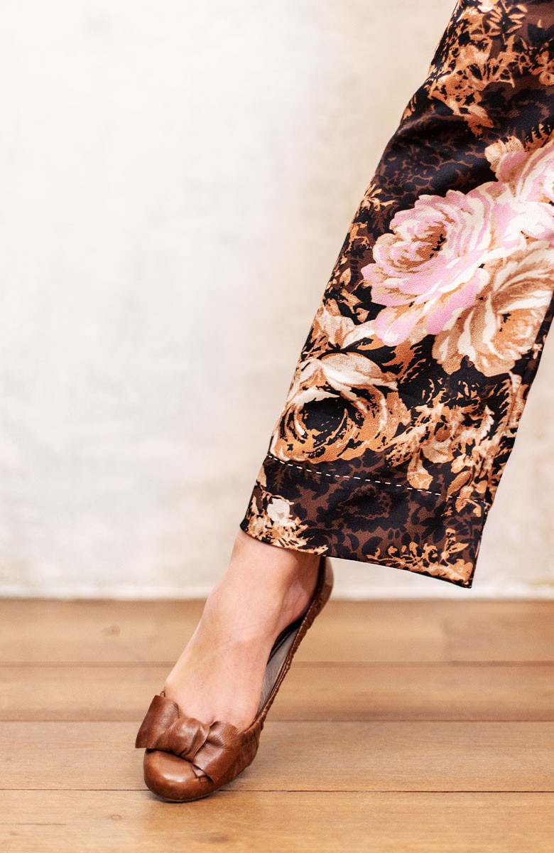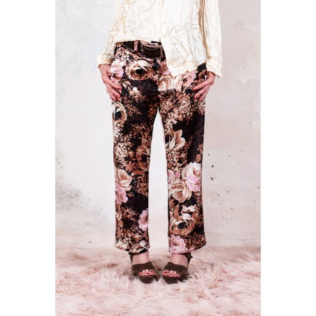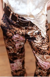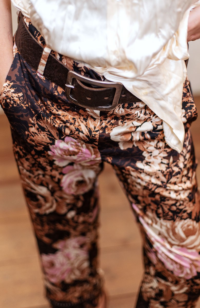 Ispirato al pantalone da lavoro da uomo, ma ricostruito attraverso volumi, proporzioni e dettagli iperfemminili, è il pantalone che va indossato con un'attitudine molto rilassata, a vita bassa, un po' baggy. Ha la gamba dritta, l'elastico dietro, la patta e i passanti per la cintura. Il cinturino, gli orli e la patta sono rifiniti con filze fatte a mano, la zip è stata tolta e i 2 bottoni automatici sono cuciti a mano. Perché? Perché non prescindiamo dalla sartorialità e dalla femminilità. Mai. Il tessuto è un raso di poliestere con effetto martellato e stampa floreale Un dettaglio importantissimo e per nulla scontato è il taglio lungo il fianco. Non è dritto, ma ruotato. Parte dal bacino davanti e arriva al fondo dietro. È una linea studiata al millimetro che veste la gamba in modo da sembrare più snella nella parte del bacino.