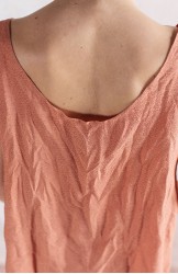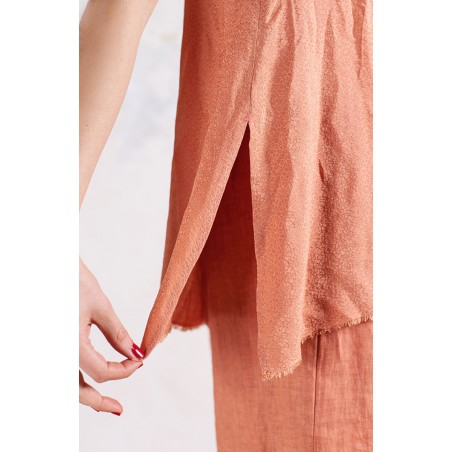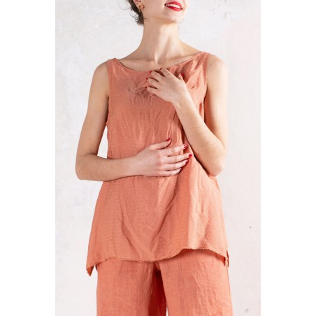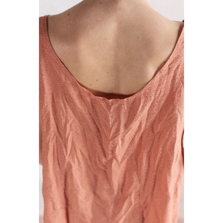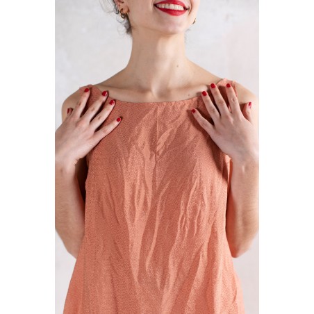 Top di pura seta lavorata a jacquard tinta nei colori ispirati alle copertine rigide di vecchi libri, quelle che sembrano uscite da un telaio, con i loro colori sussurrati, polverosi, antichi, freschi, ottocenteschi, contemporanei, perenni. Spacchi sui fianchi, cimosa al fondo e profili rifiniti tutti a mano. Il tessuto può essere increspato con effetto stropicciatura. L’increspatura è ottenuta attraverso le seguenti semplici azioni: dopo averlo lavato, il top viene attorcigliato e annodato; viene quindi lasciato ad asciugare così, appoggiato però sopra un asciugamano sullo stendino; quindi, una volta sciolti i nodi, il tessuto avrà acquisito una plissettatura naturale. Lo riceverai dentro un sacchettino di organza  Composizione e manutenzione