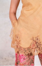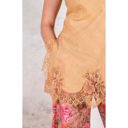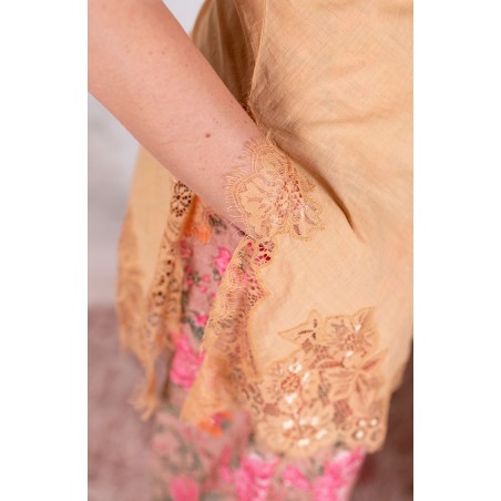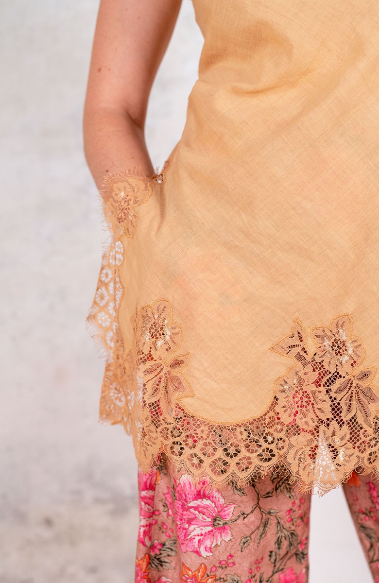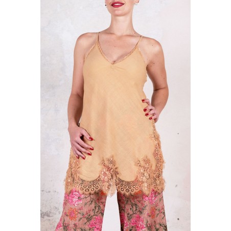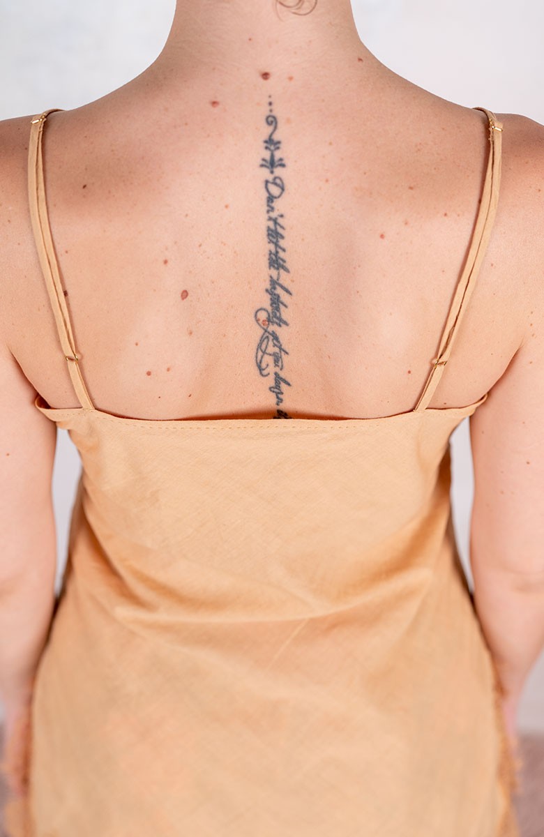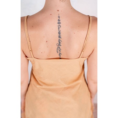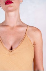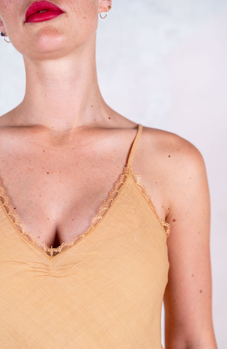 Sottoveste in leggerissimo Kadhi indiano, ha spalline sottili e regolabili e il pizzo posizionato in impeccabile simmetria lungo lo scollo, il fondo e gli spacchi laterali. Prezioso e completamente incrostato. L’incrosto è una lenta tecnica sartoriale grazie alla quale di 2 tessuti ne viene realizzato un terzo: il pizzo non viene banalmente applicato, ma è come se fosse innestato nel tessuto. Tra il pizzo e il tessuto esiste solo lo spessore minimale della cucitura. È tagliata in sbieco per poter scivolare sulle forme, senza segnarle, e rifinita con i punti a mano ed ha tre piccole nervature tra i seni, omaggio alla sartoria del passato. La riceverai dentro il sacchettino di organza nel suo stesso colore.