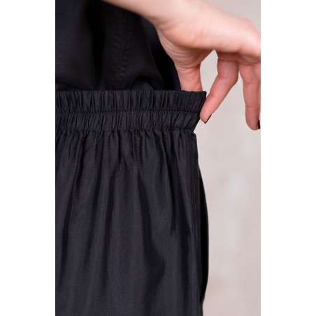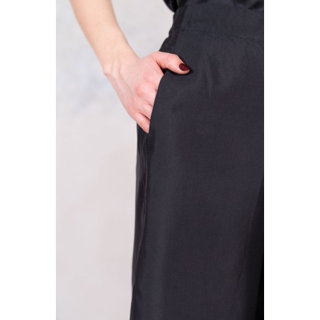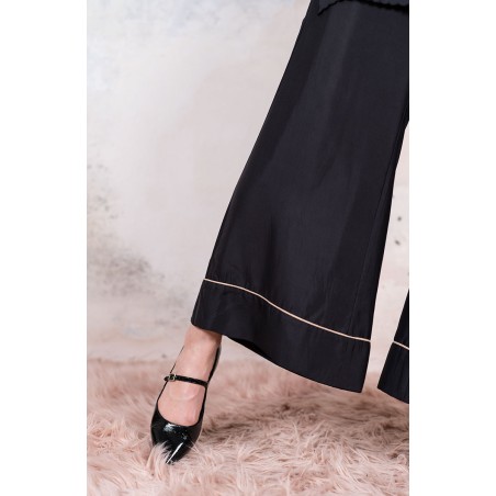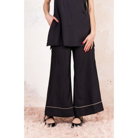 Pantalone svasato in raso di seta lavorato al rovescio. con elastico sul cinturino dietro, piping al fondo e punto a mano a contrasto in vita. Tasche profonde sul fianco. Sottopunti sul fondo fatti a mano. È tra i primissimi pantaloni di Raptus&Rose, ne hanno segnato la storia con le loro cartelle colori, ricettate al grammo. Sono tra i pantaloni più amati: mixabilissimi, con quasi tutto ciò è già nel tuo armadio: maglie, camicie, giacche, t-shirt, cappottini, kimono, stole, sneaker, mocassini, sandali, tacco 12... I Liquid ti faranno perdere la testa. Il movimento del tessuto sulle gambe quando cammini diventerà pura poesia. I tuoi passi manderanno bagliori leggeri. L'idea di avere addosso un tessuto quasi liquido ti farà innamorare.