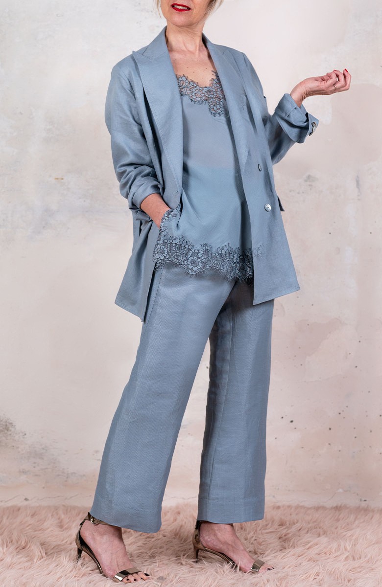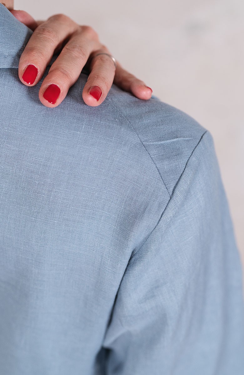 Giacca doppiopetto in lino che, resistente e morbido, esprime l’essenza della sua bellezza nelle sue increspature naturali. Attorno a lei i desideri si attorcigliano, si distendono, s’increspano, si elevano a potenza, viaggiano. La sua ispirazione nasce dalla giacca da uomo degli Anni ’30. Svuotata e ricostruita ne mantiene l’allure di eleganza ma si arricchisce di un nuovo significato di femminiltà nomade. Il suo interno è vuoto e Lei ha il peso di una camicia. I bottoni piatti a 2 fori sono di madreperla, presenti anche sul fondo manica: sono 3 e sono apribili. Ha 2 spacchi sul fondo dietro, dettaglio che arriva dalla tradizione inglese. Il collo è a lancia e i suoi lembi sono uniti con il punto mosca: un dettaglio sartoriale e completamente manuale, quasi invisibile, ma fondamentale per tenere ferma la linea del collo. Le impunture lungo i perimetri sono in evidenza e sono fatte a mano. La pattina delle tasche può essere inserita dentro la tasca stessa e così la tasca diventa a filo. La posizione della cucitura della spalla è un punto fondamentale della Travel Jacket. Non è sulla spalla ma dietro, è il dettaglio che permette di vestire la spalla, avvolgendola e non semplicemente coprendola. Composizione e manutenzione