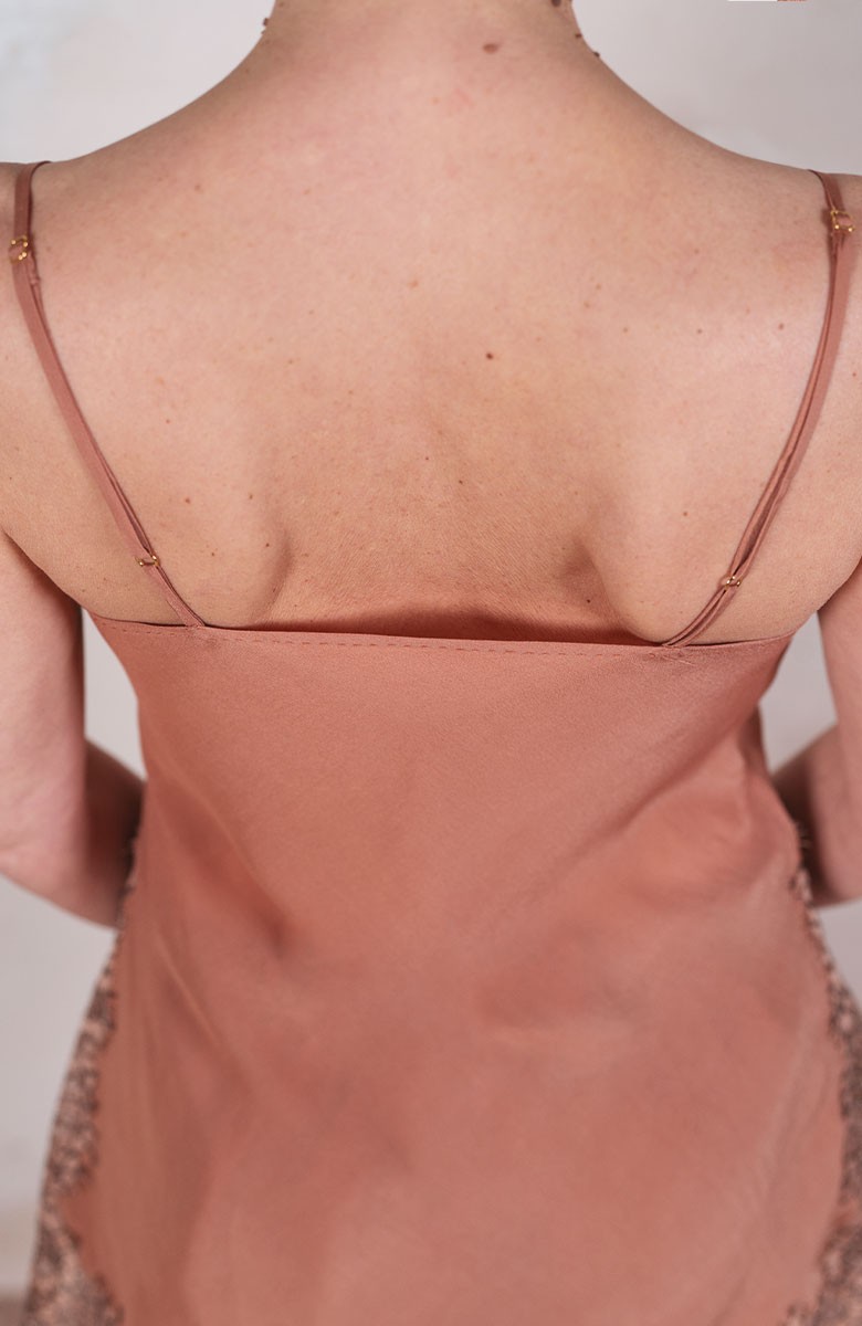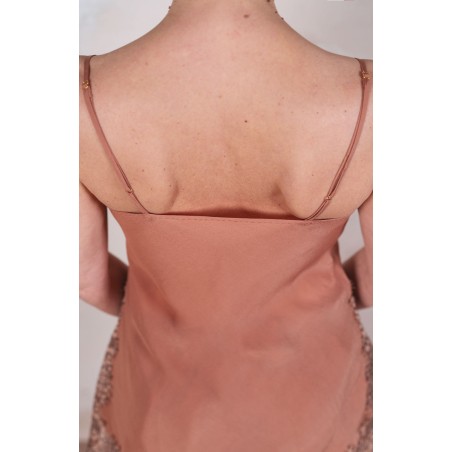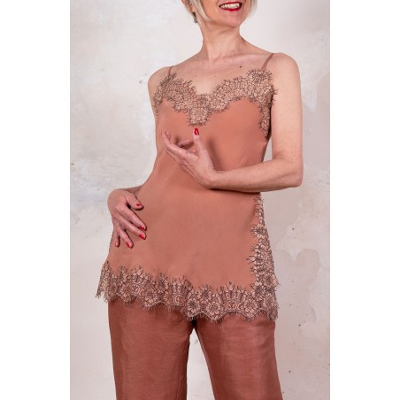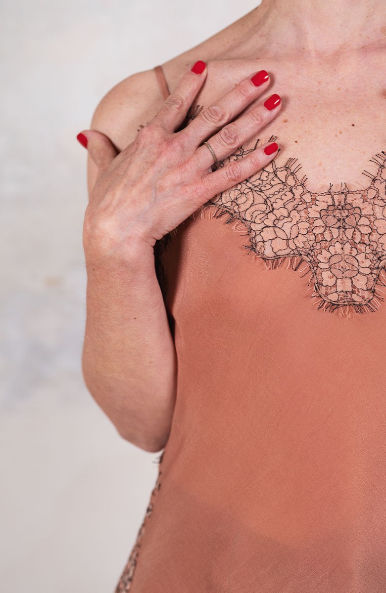 Si chiama sottoveste, eppure la indossi come una t-shirt. Della sottoveste ha le spalline sottili e regolabili, il pizzo posizionato in impeccabile simmetria lungo lo scollo, il fondo e gli spacchi laterali. Prezioso e completamente incrostato. L’incrosto è una lenta tecnica sartoriale grazie alla quale di 2 tessuti ne viene realizzato un terzo: il pizzo non viene banalmente applicato, ma è come se fosse innestato nel tessuto. Tra il pizzo e il tessuto esiste solo lo spessore minimale della cucitura. Il tessuto è crêpe di viscosa, leggerissima, tagliata in sbieco per sfruttare la naturale elasticità del tessuto che scivola così sulle forme, senza segnarle. Per ottenere il crêpe si usano fili ritorti, sottili e compatti, che conferiscono resistenza e una superficie leggermente increspata. Della t-shirt ha la versatilità, la comodità, la facilità. Lei sarà la tua complice prediletta per essere tutte le mille te che sono in te. La riceverai dentro il sacchettino di organza nel suo stesso colore.