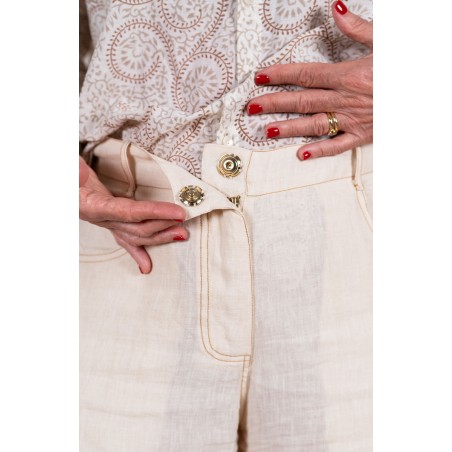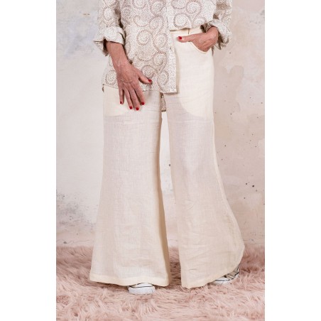 Pantalone svasato di lino leggero. Chiusura con zip di metallo e bottone automatico. Passanti per la cintura e tasche profonde sul fianco.