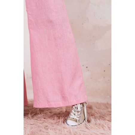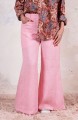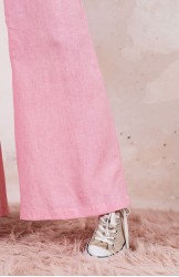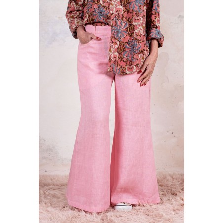 Pantalone svasato di lino leggero. Chiusura con zip di metallo e bottone automatico. Passanti per la cintura e tasche profonde sul fianco.