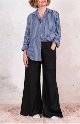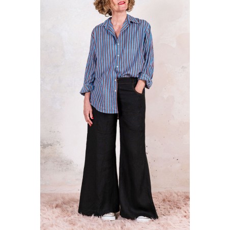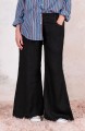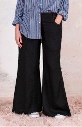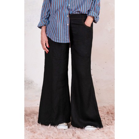 Pantalone svasato di lino leggero. Chiusura con zip di metallo e bottone automatico. Passanti per la cintura e tasche profonde sul fianco.