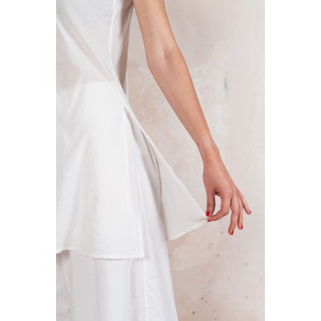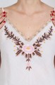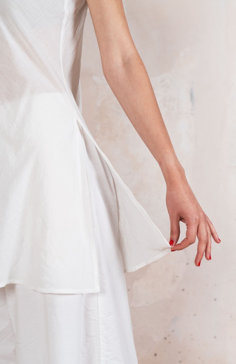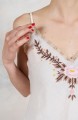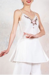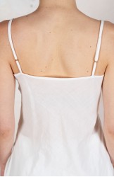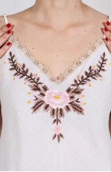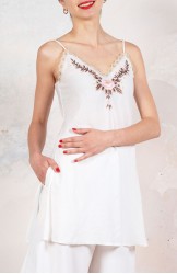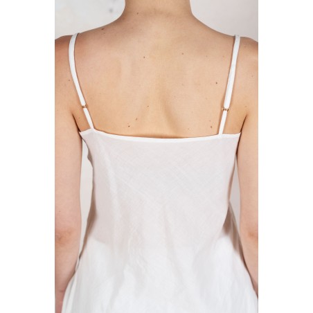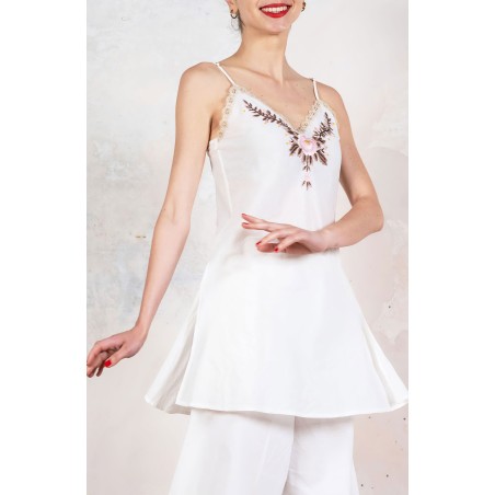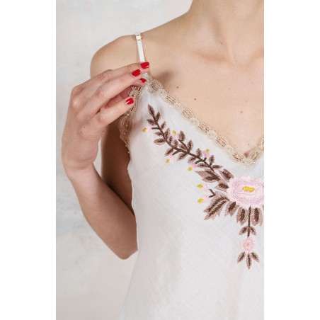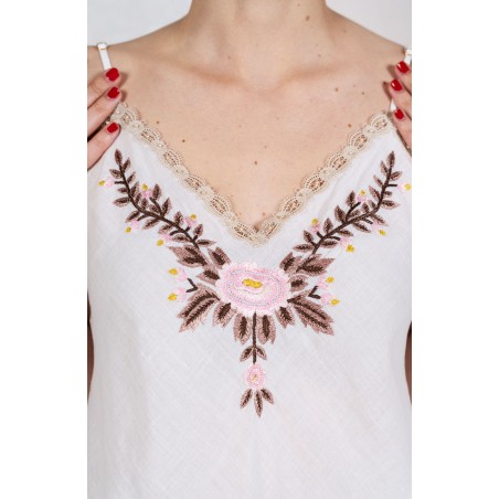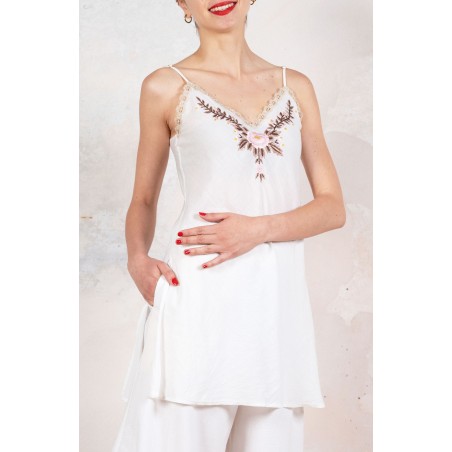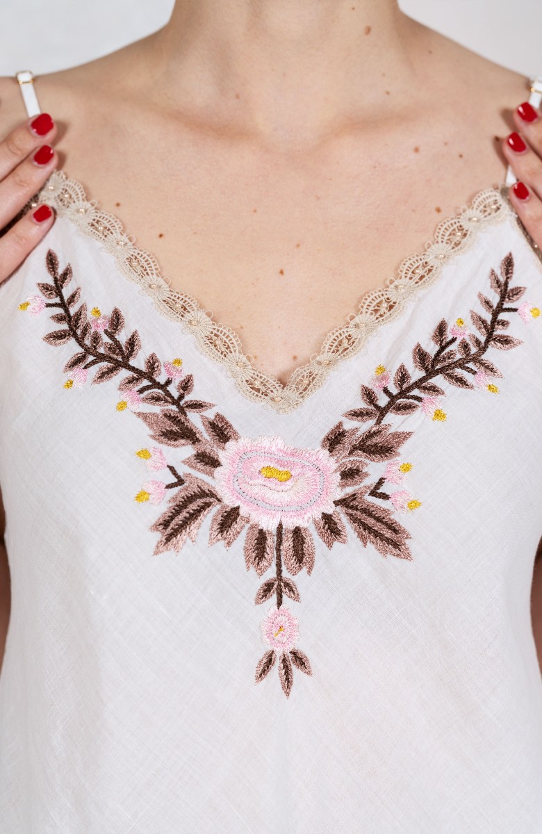 Top sottoveste in leggerissimo khadi indiano, il cotone filato e tessuto a mano. A mano è realizzato anche il prezioso ricamo a fiori sullo scollo davanti, a mano è incrostato il pizzo lungo lo l’orlo dello scollo, a mano sono applicate le perline sul pizzo.