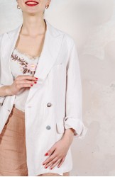Giacca doppiopetto in lino gessato, ove “gessato” è esattamente l’opposto si quell’immaginario di rigidità ispirato alla classica giacca gessata: le righe chiare e morbide, infatti, creano un delicato e sfumato contrasto con il bianco del tessuto. Parola d’ordine: leggerezza.