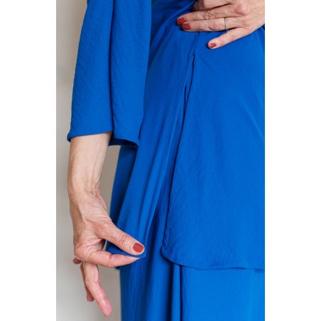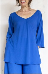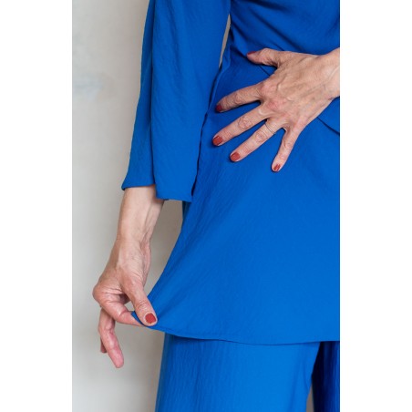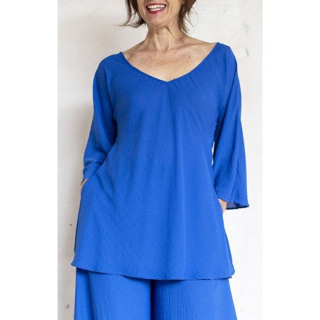 Blouse con scollo profondo e maniche a kimono. Tessuto tagliato in sbiego, profili rifiniti con punti a mano. Colore blu Majorelle. E’ la blouse perfetta, scivola fluida e liquida sul corpo e la asseconda nei movimenti e nelle forme, perché tagliato in sbieco e rifinito con infiniti punti a mano. La scollatura profonda e sapiente è ultra femminile. Pesa pochi grammi, non si stropiccia. La lavi, la asciughi al sole e la metti dopo mezz’ora. Compagna inseparabile di viaggio. Irrinunciabile.