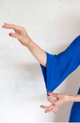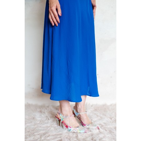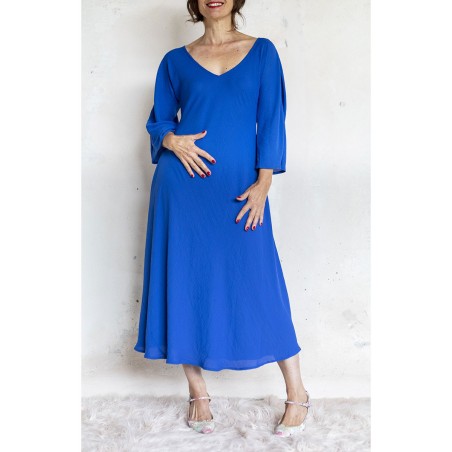Vestito con scollo profondo e maniche a kimono. Tessuto tagliato in sbiego, profili rifiniti con punti a mano e inserto triangolare sul fondo davanti ispirato agli abiti sartoriali degli anni Venti. Colore blu Majorelle. E’ l'abito perfetto, scivola fluido e liquido sul corpo e lo asseconda nei movimenti e nelle forme, perché tagliato in sbieco e rifinito con infiniti punti a mano. La scollatura profonda e sapiente è ultra femminile. Pesa pochi grammi, non si stropiccia. Lo lavi, lo asciughi al sole e lo metti dopo mezz’ora. Compagno inseparabile di viaggio. Irrinunciabile.