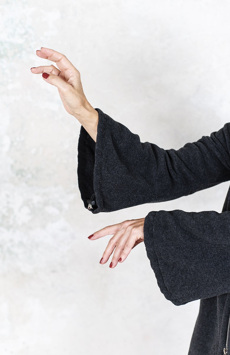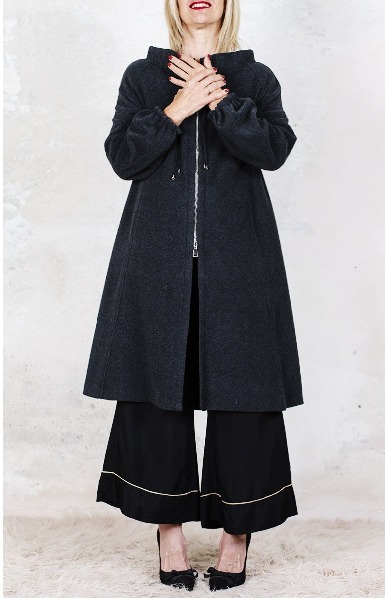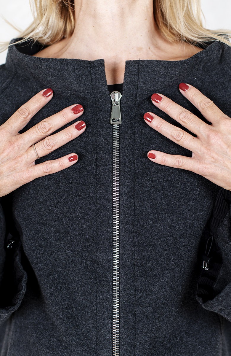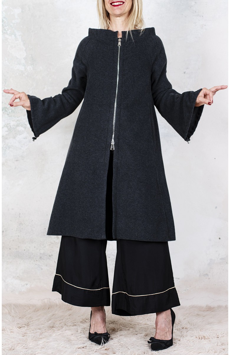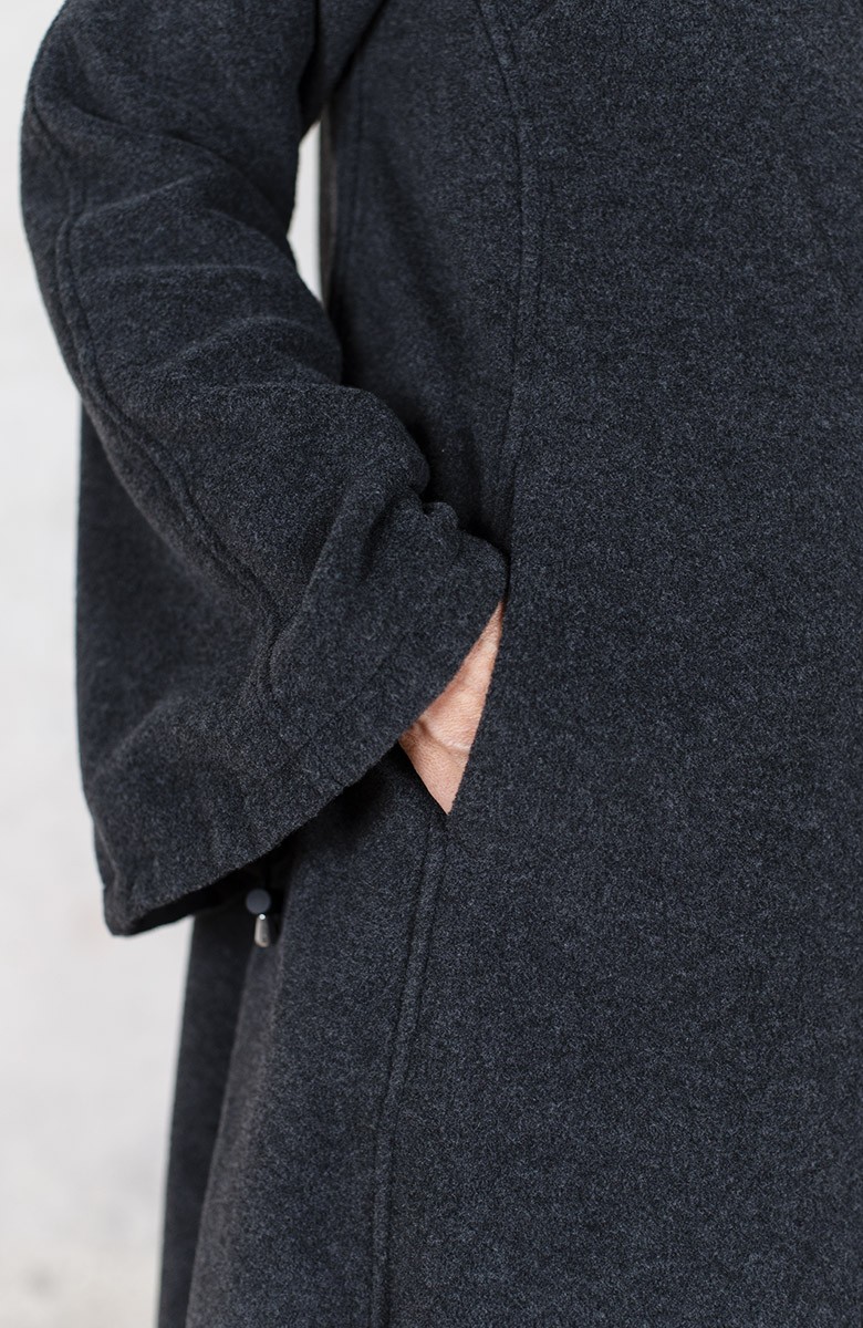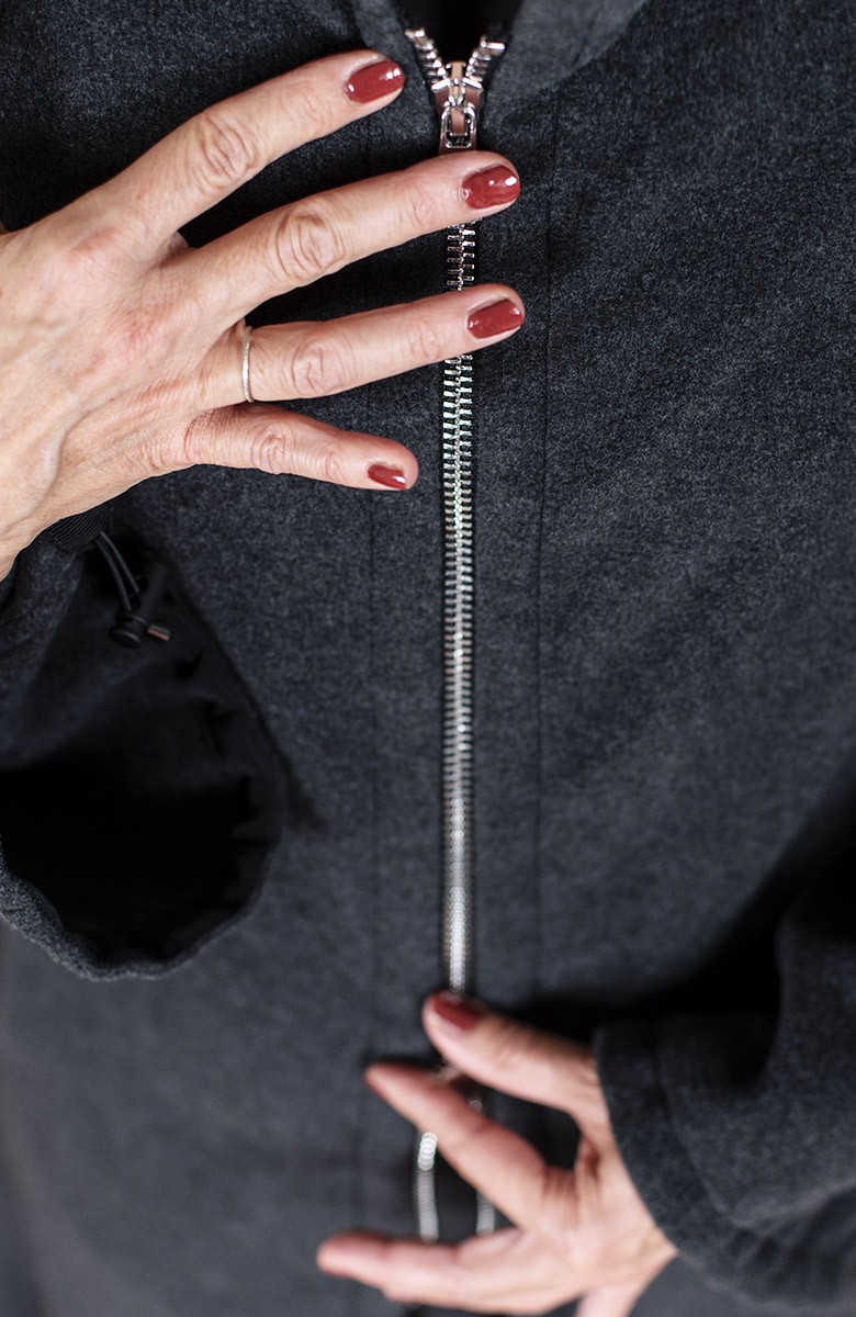 Lui è l’ossimoro degli ossimori, un’ardita sfida di progettazione, ricerca, sartoria. Ovvero: come mettere insieme il pile, il tessuto più caldo del mondo, ma destinato esclusivamente all’abbigliamento sportivo, e l’allure dell’haute couture Anni ’50, che era il concentrato dell’eleganza femminile del secolo scorso. Due estremi assoluti che s’incontrano in un cappottino, anzi in un Raptus Coat, che è un cappotto a tutti gli effetti. Il tessuto di pile, la chiusura sul davanti con la zip bidirezionale, la coulisse al fondo manica, la possibilità di lavarlo in lavatrice a 30°, sono dettagli tipici che arrivano dai capi sportivi. La sua forma svasata, il suo giromanica, i suoi volumi, le sue cuciture, la manica a trombetta (che diventa a palloncino chiudendola con la coulisse) il suo colore antracite melange, il collo a cratere fanno di lui un cappottino che sembra uscito da una sartoria degli anni ‘50.