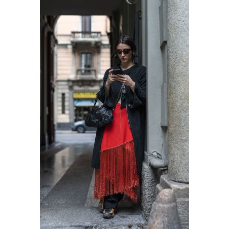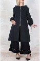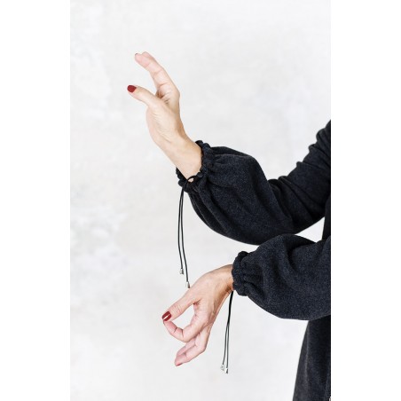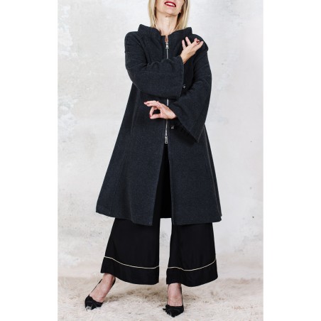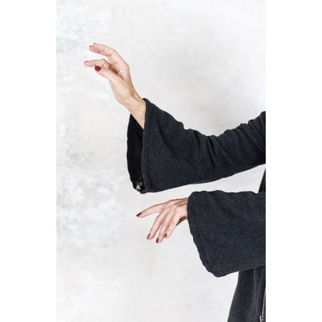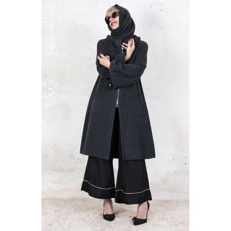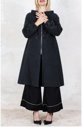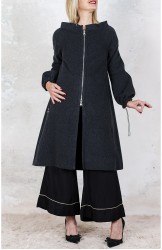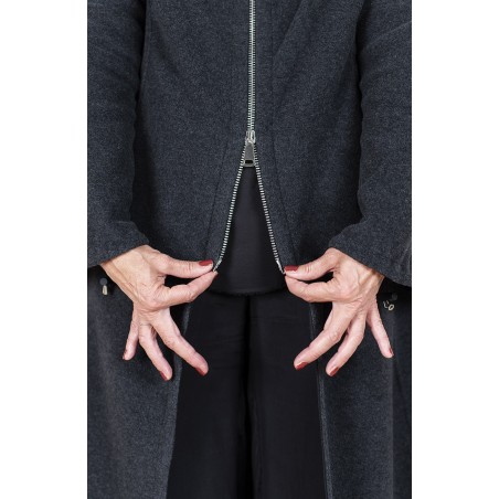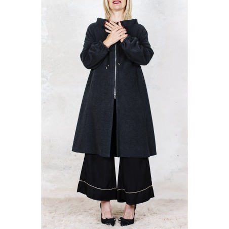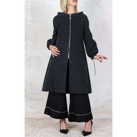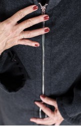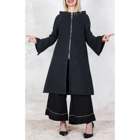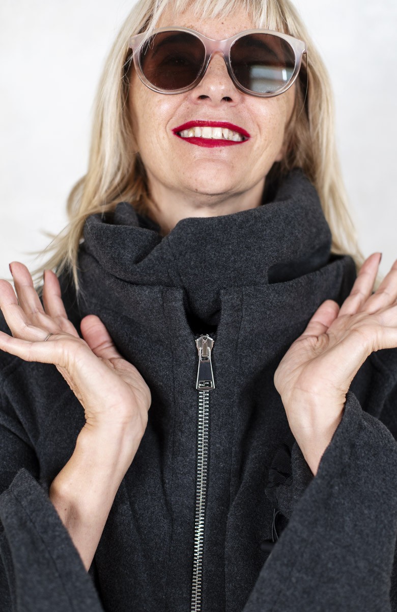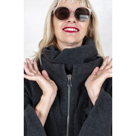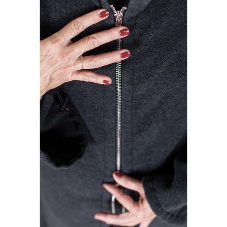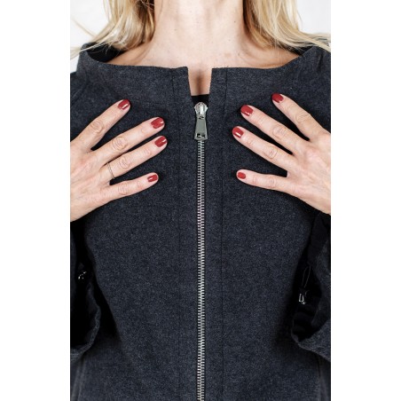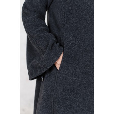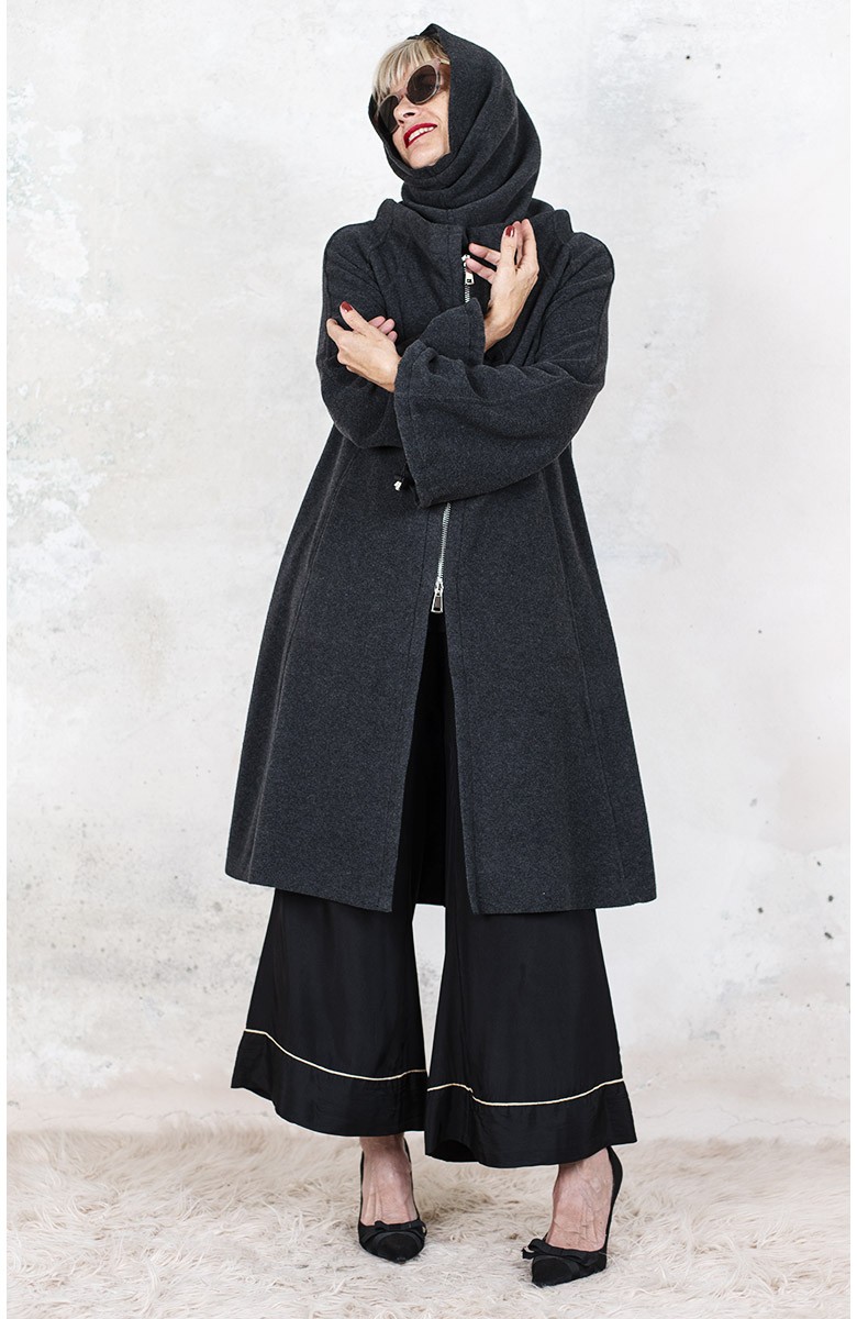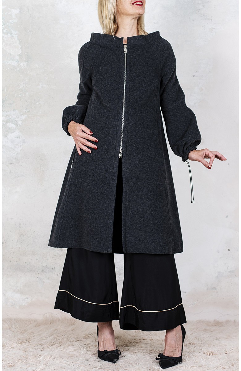 Lui è l’ossimoro degli ossimori, un’ardita sfida di progettazione, ricerca, sartoria. Ovvero: come mettere insieme il pile, il tessuto più caldo del mondo, ma destinato esclusivamente all’abbigliamento sportivo, e l’allure dell’haute couture Anni ’50, che era il concentrato dell’eleganza femminile del secolo scorso. Due estremi assoluti che s’incontrano in un cappottino, anzi in un Raptus Coat, che è un cappotto a tutti gli effetti. Il tessuto di pile, la chiusura sul davanti con la zip bidirezionale, la coulisse al fondo manica, la possibilità di lavarlo in lavatrice a 30°, sono dettagli tipici che arrivano dai capi sportivi. La sua forma svasata, il suo giromanica, i suoi volumi, le sue cuciture, la manica a trombetta (che diventa a palloncino chiudendola con la coulisse) il suo colore antracite melange, il collo a cratere fanno di lui un cappottino che sembra uscito da una sartoria degli anni ‘50.