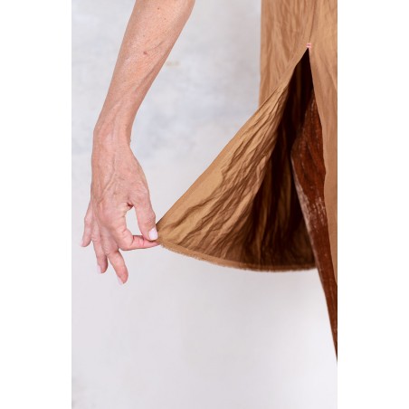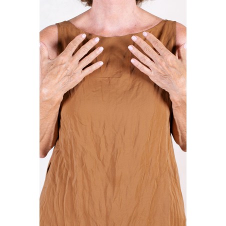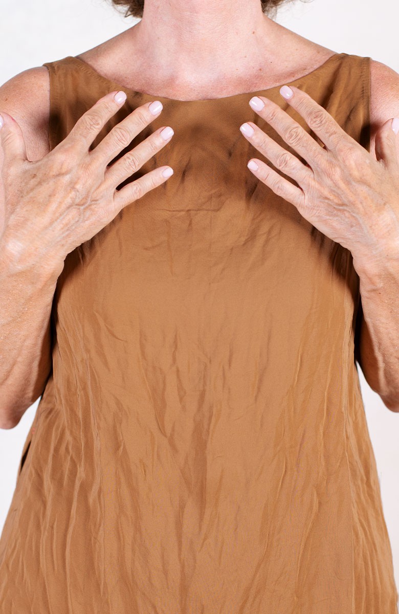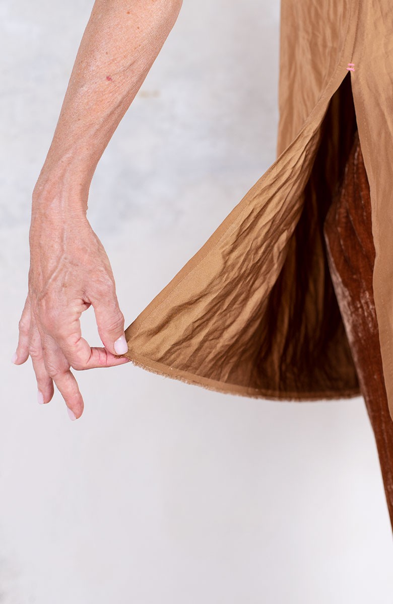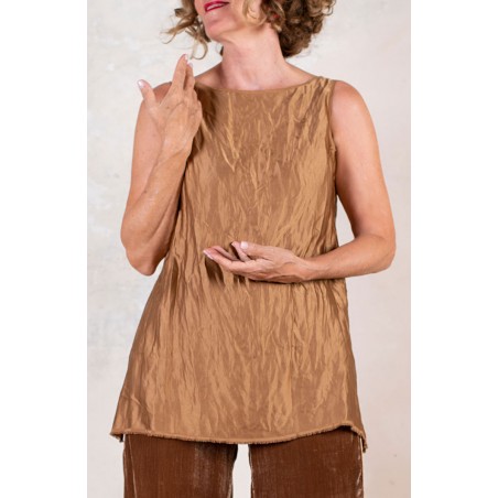 Top di pura seta tinta nei colori ispirati al viaggio di ricerca in Giappone. Spacchi sui fianchi, cimosa al fondo e profili rifiniti tutti a mano. Il tessuto può essere increspato con effetto stropicciatura. L’increspatura è ottenuta attraverso le seguenti semplici azioni: dopo averlo lavato, il top viene attorcigliato e annodato; viene quindi lasciato ad asciugare così, appoggiato però sopra un asciugamano sullo stendino; quindi, una volta sciolti i nodi, il tessuto avrà acquisito una plissettatura naturale. Leggero come un petalo, fresco come vento sottile, pieno di punti cuciti a mano. Pesa pochi grammi. Più lo lavi e lo asciughi annodato e attorcigliato, più diventa bello. Ha un lato è opaco e l’altro lucido. E può essere indossato su entrambi.