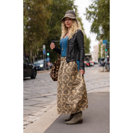Gonna con elastico in vita con arriccio, vestibilità ultra comoda, tasche profonde sui fianchi, la Travel Skirt è la gonna di cui non potrai fare a meno. Il suo tessuto è un broccato oro e nero d’ispirazione indiana. Sul retro sono visibili i fili flottanti, ovvero i fili lasciati liberi dalla lavorazione, per questo al suo interno c’è una fodera, morbida e fluida sul cui fondo è stato applicato un pizzo delicato, come si faceva quando i dettagli nascosti erano più importanti di quelli visibili. Il suo volume, la sua versatilità, il suo tessuto, fanno di lei la gonna ideale da mettere in valigia, ma anche da indossare nella tua quotidianità e nei tuoi giorni speciali. Dal tacco 12 alle sneaker!