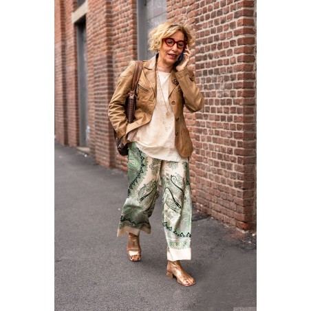 Una collezione inestimabile, che arriva da viaggi di ricerca e da un amore inscalfibile per un oggetto iconico. Nell’Archivio Segreto dell’Atelier sul Fiume i foulard vintage di seta sono i protagonisti. Bellissimi. Sempre più introvabili. Ne abbiamo scelti 3 e abbiamo fatto riprodurre le loro stampe, trasformandoli in pantaloni. Gli Extreme Foulard Pijama Pant sono pantaloni in twill di seta. Non semplicemente stampati, ma stampati proprio con quei disegni originali, il cui posizionamento è stato studiato con perfezione geometrica. Estremi nel comfort con il loro elastico dietro in vita, il cinturino davanti, le profonde tasche a filetto, la morbidezza del tessuto. Estremi nella bellezza con il loro fianco unito, cioè privo di cuciture sul lato, che non interrompe l’armonia delle stampe, la linea dell’interno gamba che di fatto ti toglie una taglia, le cuciture piatte e i punti a mano sul fondo. Un capolavoro sartoriale e un inchino nostalgico a quei tempi in cui il foulard non era un pezzo di tessuto, ma un racconto d’amore.