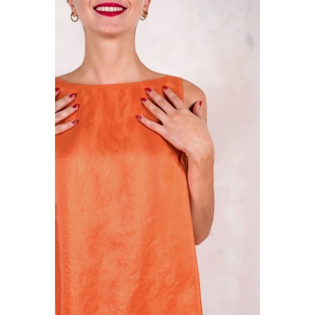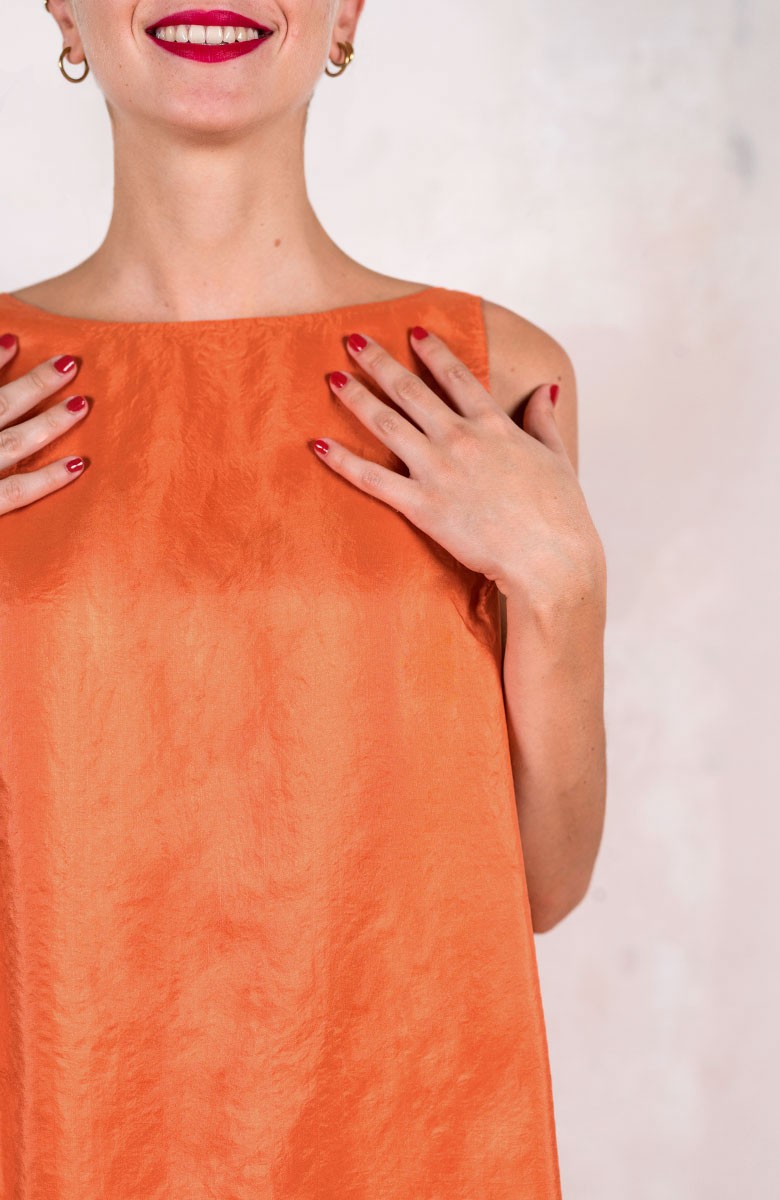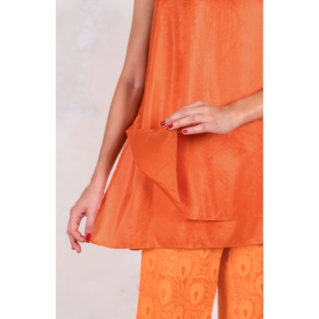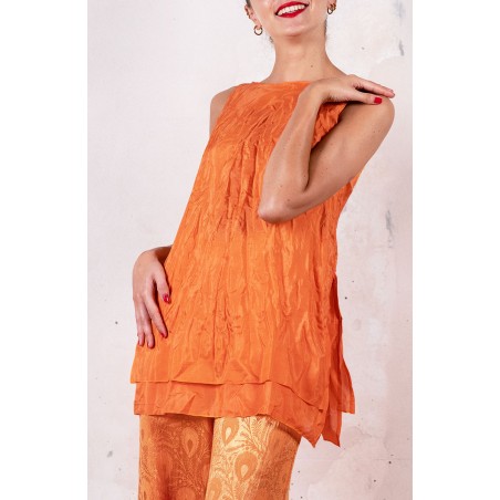 Top di pura seta, leggerissima, tinta nei colori dell’Archivio di Raptus&Rose: nostalgici, freschi, contemporanei, perenni. Grazie al doppio strato della seta, sembra che questo top sia uscito da uno dei preziosi bauli nella soffitta della bisnonna; grazie alla sua linea pulita e svasata, al suo collo a barchetta è quanto mai contemporaneo e versatile. Spacchi sui fianchi, cimosa al fondo e profili rifiniti tutti a mano. Il tessuto può essere increspato con effetto stropicciatura. L’increspatura è ottenuta attraverso le seguenti semplici azioni: dopo averlo lavato, il top viene attorcigliato e annodato; viene quindi lasciato ad asciugare così, appoggiato però sopra un asciugamano sullo stendino; quindi, una volta sciolti i nodi, il tessuto avrà acquisito una plissettatura naturale.