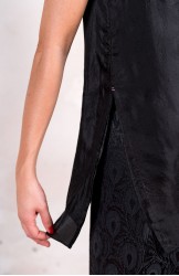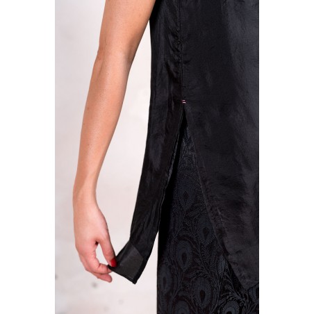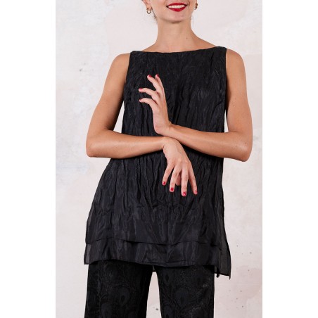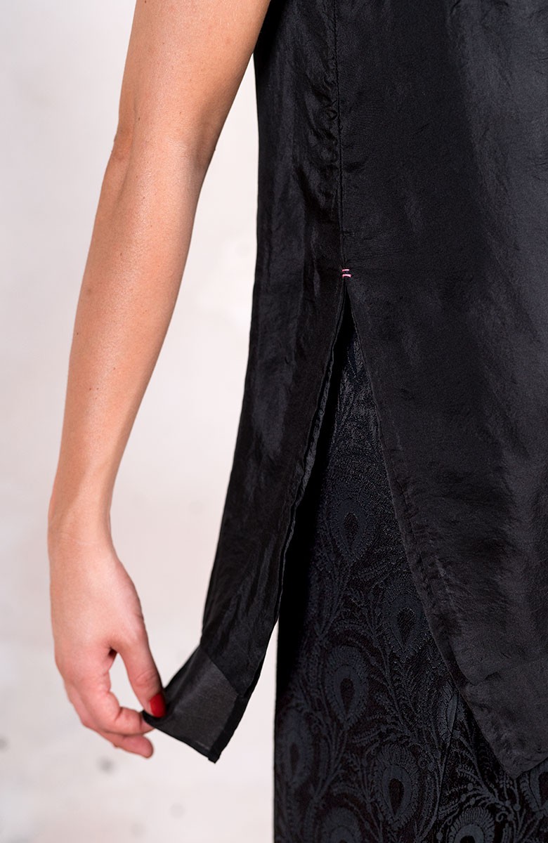 Top di pura seta, leggerissima, tinta nei colori dell’Archivio di Raptus&Rose: nostalgici, freschi, contemporanei, perenni. Grazie al doppio strato della seta, sembra che questo top sia uscito da uno dei preziosi bauli nella soffitta della bisnonna; grazie alla sua linea pulita e svasata, al suo collo a barchetta è quanto mai contemporaneo e versatile. Spacchi sui fianchi, cimosa al fondo e profili rifiniti tutti a mano. Il tessuto può essere increspato con effetto stropicciatura. L’increspatura è ottenuta attraverso le seguenti semplici azioni: dopo averlo lavato, il top viene attorcigliato e annodato; viene quindi lasciato ad asciugare così, appoggiato però sopra un asciugamano sullo stendino; quindi, una volta sciolti i nodi, il tessuto avrà acquisito una plissettatura naturale.