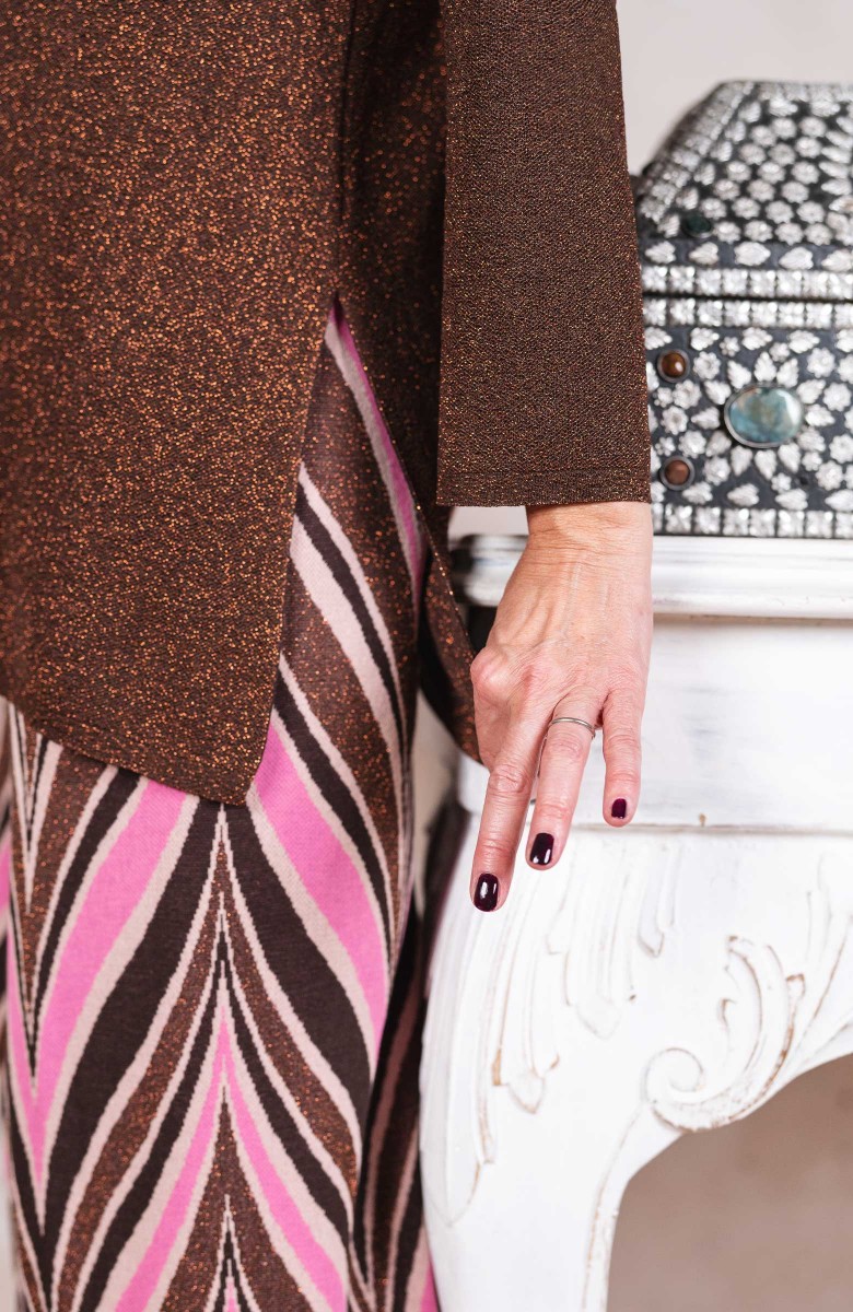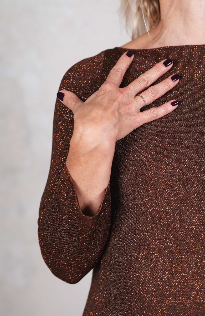 Il suo nome la definisce. Iconica è la sua forma: la svasatura, il collo a barchetta, gli spacchi laterali, le spalle asciutte, la manica gentile. Bijoux è il bagliore soffuso dal morbidissimo filo di lurex, intrecciato al warm cotton, per 4 varianti sofisticate, ma facili da indossare: oro pallido, nero brillante, rame caldo, argento profondo. Lei è la maglia ultrafemminile e ultracomoda, che fa ti te una vera comodiva. Le cuciture sono tutte realizzate a rimaglio -l’equivalente dei punti a mano in sartoria-: non solo estremamente tecniche ed elastiche, ma anche belle da vedere. La puoi indossare nella tua quotidianità, perché possiede tutta l’irrinunciabile comodità dell’accoglienza. La puoi indossare ad un party glamour, perché ha tutta l’allure di un abito da sera. Composizione e manutenzione
