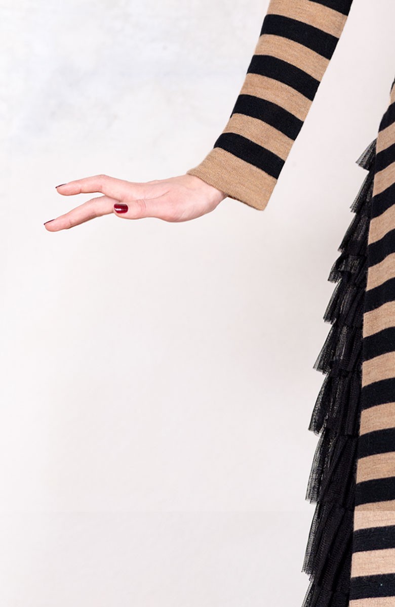 Trasformabile. Moltiplicabile. Indefinibile. Abito, Maglia. Wool Striped Dressweater, dalla lunghezza inedita, che ti farà scoprire nuove te. In lana merino, con quella forma diventata nel tempo iconica: svasata al fondo, ma asciutta sulle spalle, con lo scollo a barchetta, le maniche gentili, gli spacchi ai lati (studiatissimi) E quelle righe, anch’esse iconiche, forti nella loro identità, ma neutre e mixabili con qualsiasi stampa. Abbinabile con tutto e il contrario di tutto.