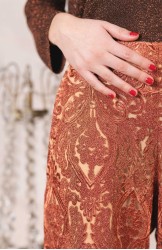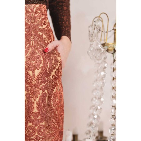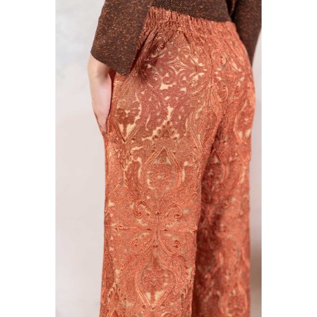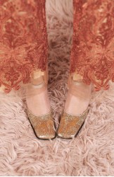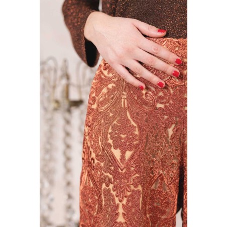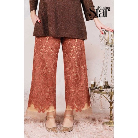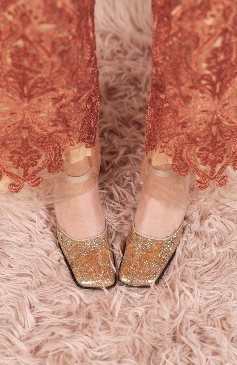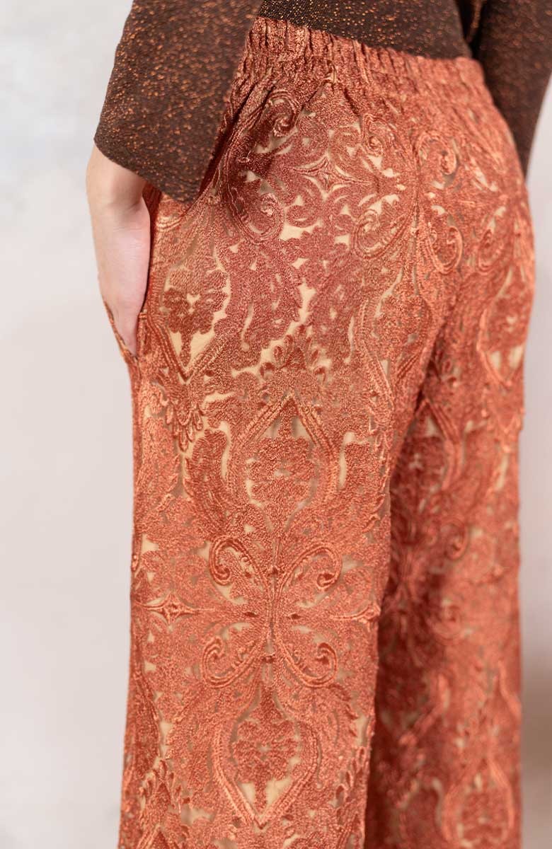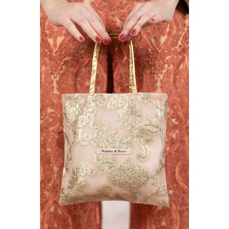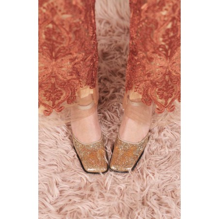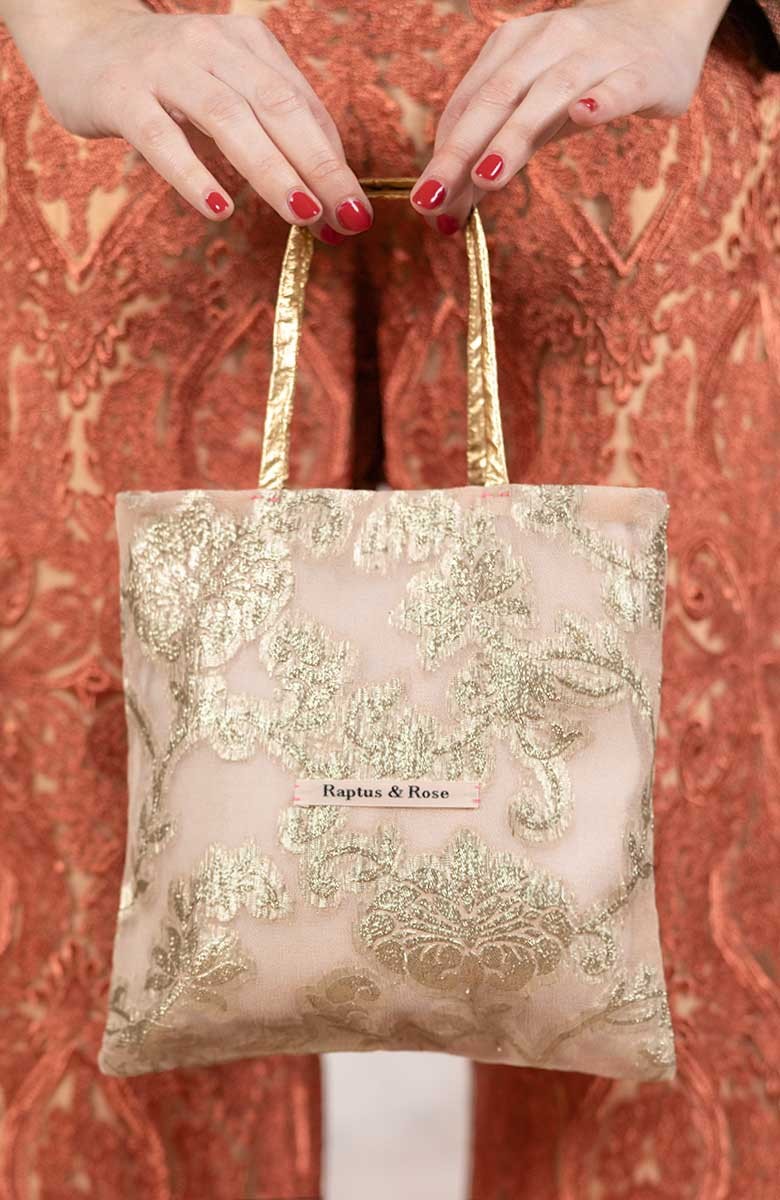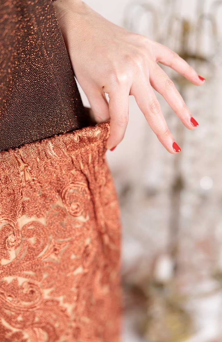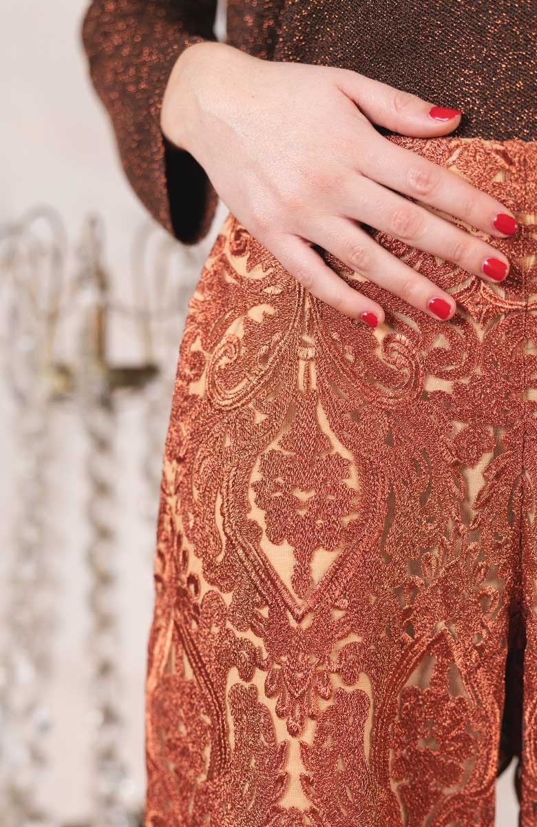 È la terza Raptus Star, ovvero il progetto che riedita, tali e quali, i capi iconici della storia di Raptus&Rose. Gli OMG Pant nascono nel 2015 negli Emirati Arabi, dove fu trovato il loro tessuto: un tulle leggerissimo, eppure riccamente ricamato con un filo di lurex che disegna volute arabeggianti. Trasformare quel tessuto, destinato ad essere tutt’altro, in un pantalone fu una sfida. Innanzitutto, doveva essere foderato e la scelta fu una mussola di cotone che, leggera, morbida, essenziale sembra essere il controcanto alla sontuosità del tessuto. Poi il suo piazzamento: studiato nei dettagli perché fosse perfettamente simmetrico e creasse l’equilibrio perfetto. La forma del pantalone è quella del Pijama Pant: gamba dritta, fianco unito - cioè non ci sono cuciture sul lato esterno della gamba, per non interrompere il disegno del ricamo - tasche profonde alla francese, elastico morbido in vita. Sul cinturino davanti, la firma di Raptus&Rose: una filza fatta a mano con il filo Indian Pink. È il pantalone che risolve tutti i tuoi giorni speciali: tutti i Natali e i Capodanni che verranno, tutti i compleanni e i matrimoni a cui ti inviteranno, tutte le Epifanie che si manifesteranno. È il pantalone che riolve tutti i tuoi look: dai tacchi alle sneaker; dai giubbotti ai cappotti; dai top in seta ai maglioni in lana; dalle giacche da uomo alle stole più femminili. Composizione e manutenzione