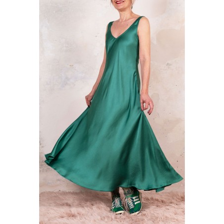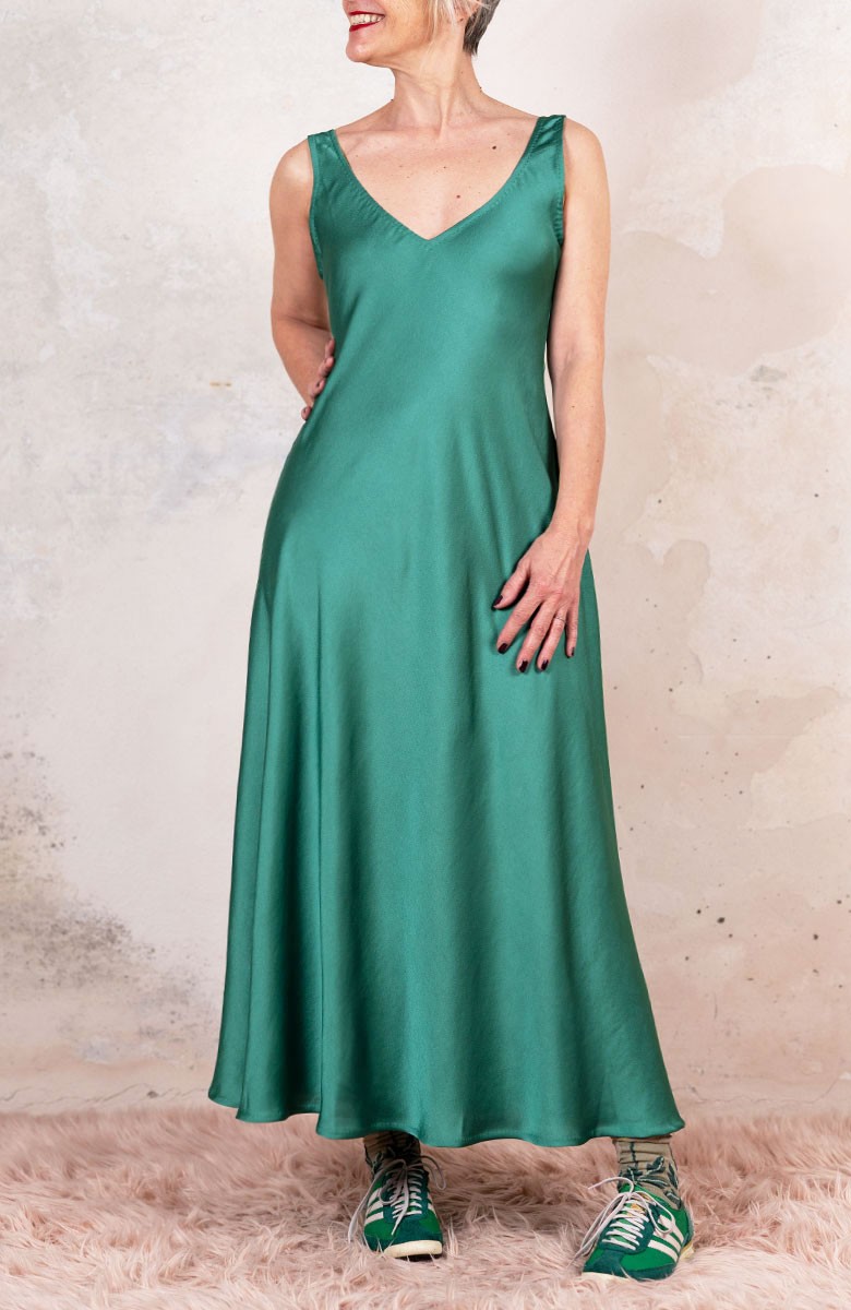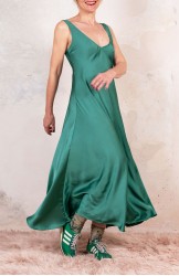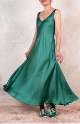Vestito senza maniche con scollo profondo. E’ l'abito perfetto, scivola fluido e liquido sul corpo e lo asseconda nei movimenti e nelle forme, perché tagliato in sbieco e rifinito con infiniti punti a mano. La scollatura profonda e sapiente è ultra femminile. Pesa pochi grammi. Compagno inseparabile di viaggio, sempre.