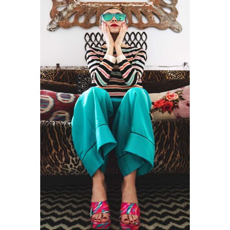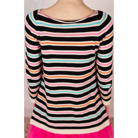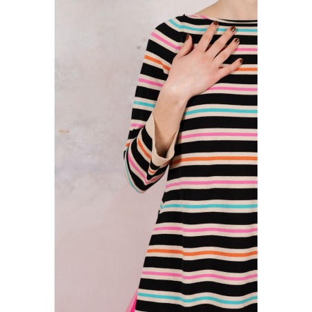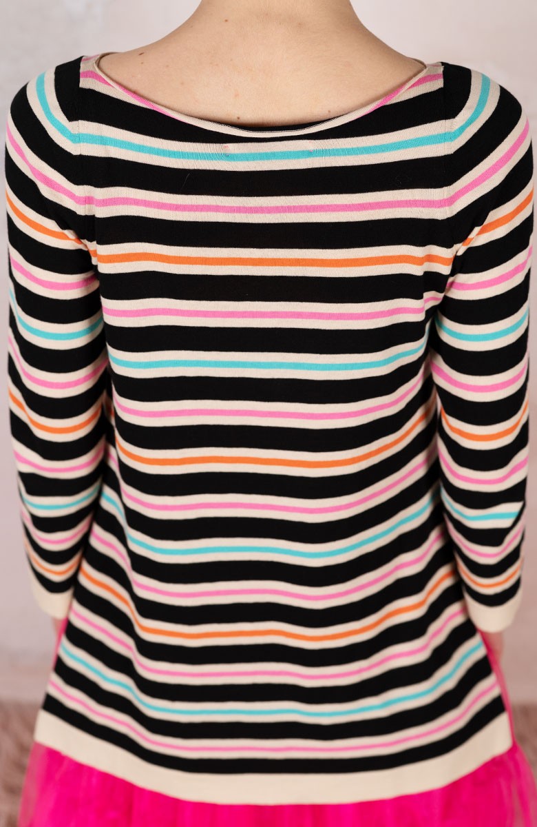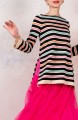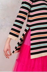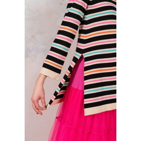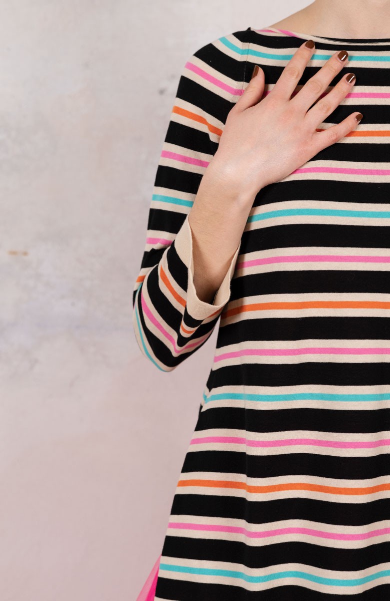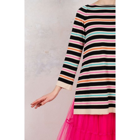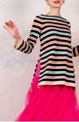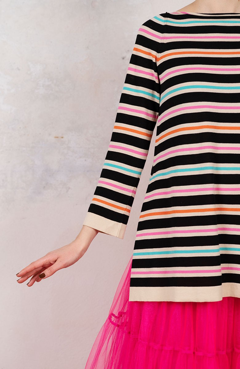 Maglia di cotone Pima a righe con scollo a barchetta e spacchi sui fianchi. Lavorata in maglieria calata e cucita interamente a rimaglio. Il suo filato è il leggendario e pregiato Cotone degli Dei, coltivato e raccolto a mano sugli altopiani peruviani. La raccolta manuale, che rispetta un'antica tradizione, viene utilizzata per non interrompere la fibra particolarmente lunga e sottile, che dona a questo filato lucentezza e sofficità ineguagliabili. La lavorazione è artigianale. Ogni maglia è confezionata singolarmente su macchine con aghi sottilissimi.