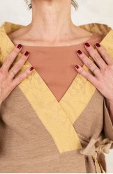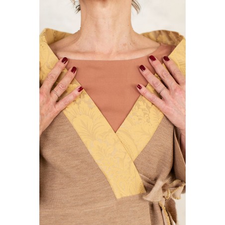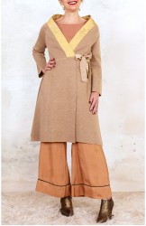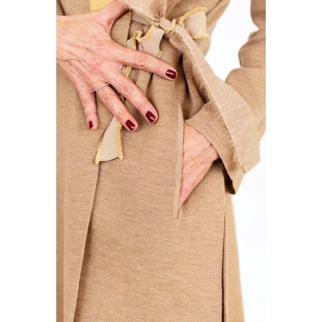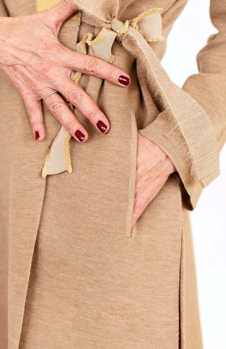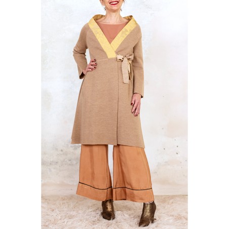 Cappottino di lana merinos in punto roma, lavorato con calature in cimosa. Collo applicato di broccato veneziano e chiusura di nastro di gros grain di mohair.